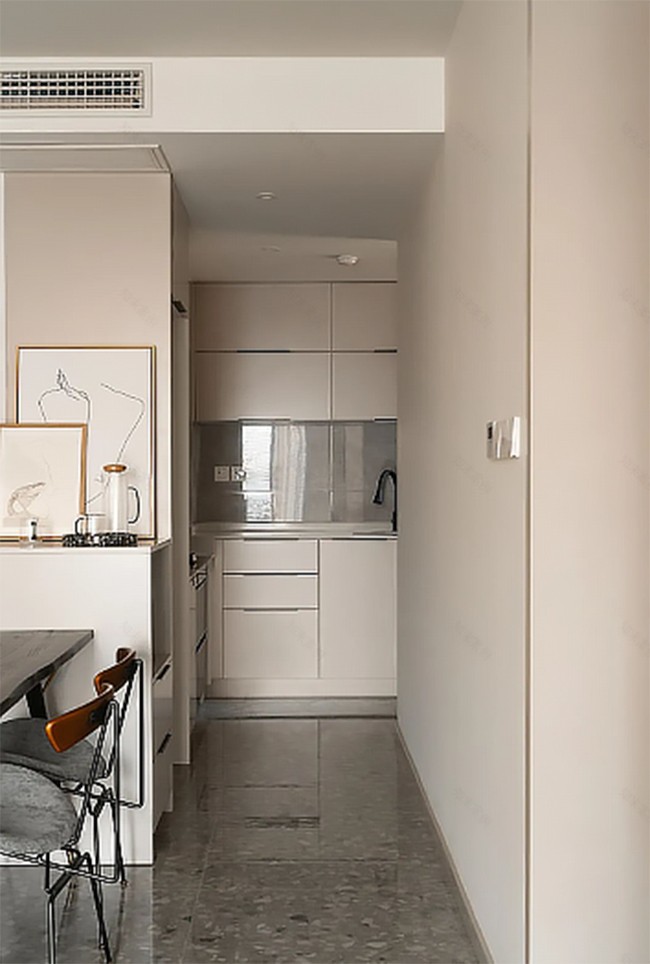 將原本的兩個空間打通,打造L型開放式廚房,米白色櫥柜與墻漆一色,讓收納“隱形”,視覺更為整潔清爽。