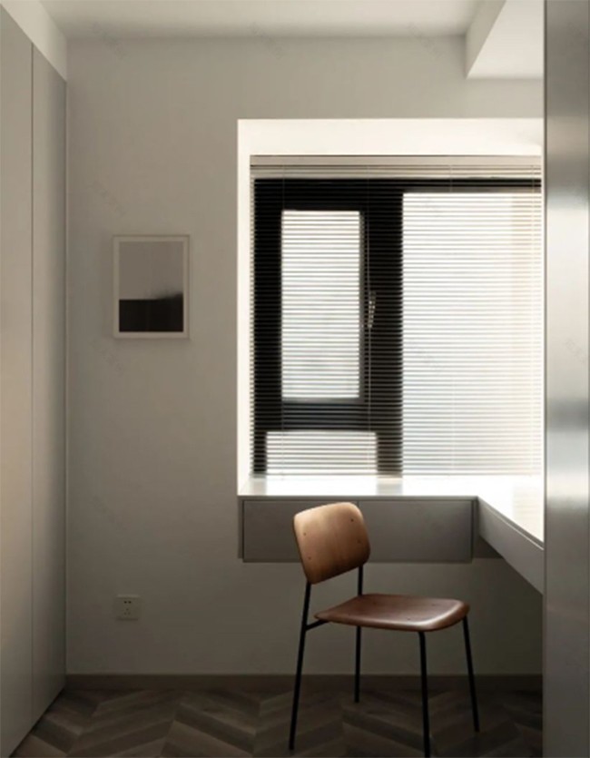 依據(jù)窗戶位置打造轉(zhuǎn)角梳妝桌,大面積的窗戶,選用百葉簾,帶來充足的采光,空間通透大氣。人字拼地面,讓簡約的空間富有變化