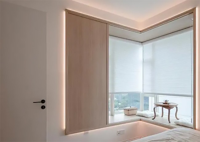 為減少留白的單調(diào)感,飄窗一側(cè)采用了木飾面處理,讓空間層高更有延展性。同時(shí),窗套一圈的線性燈光,也減少了視覺上的厚重。