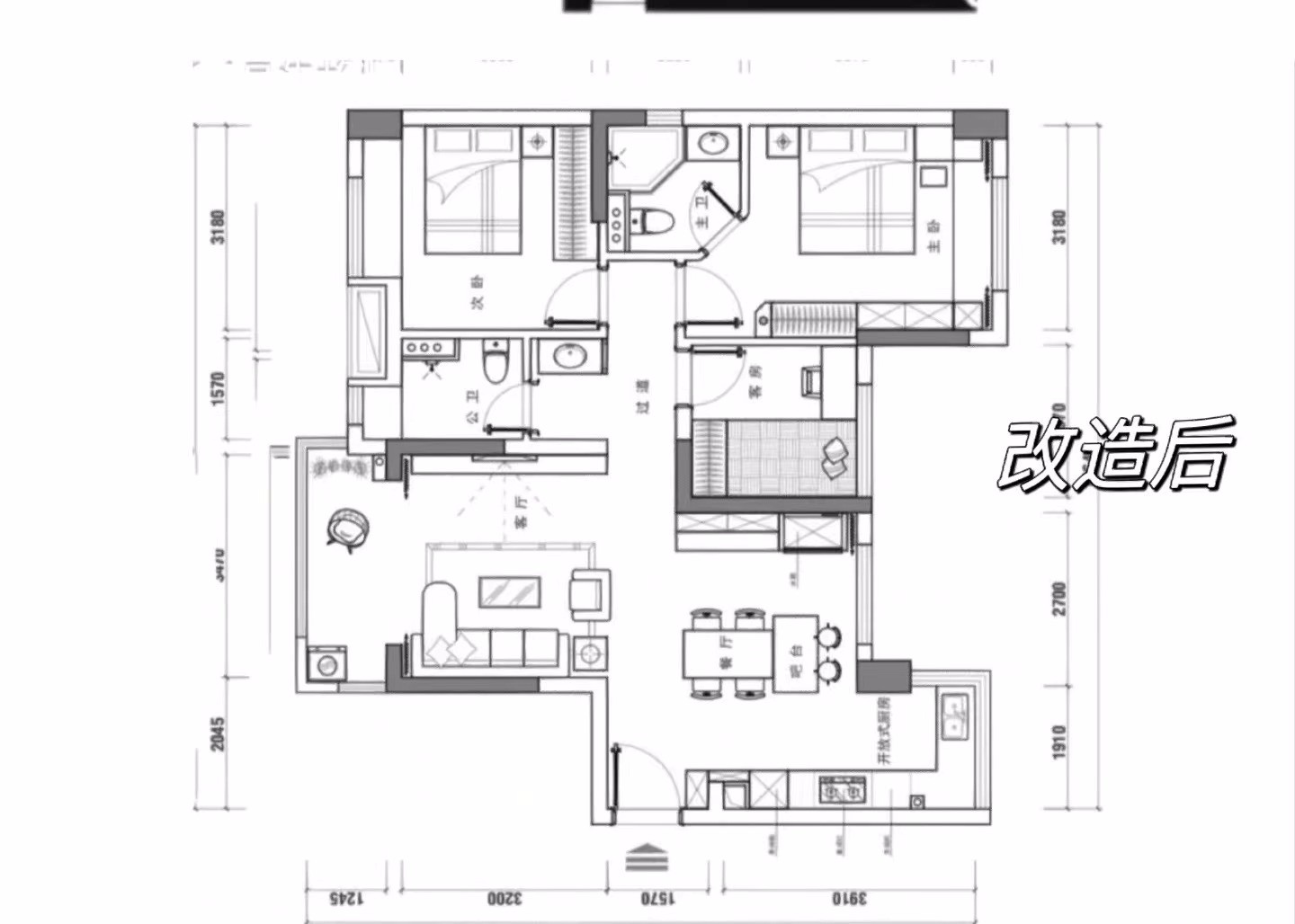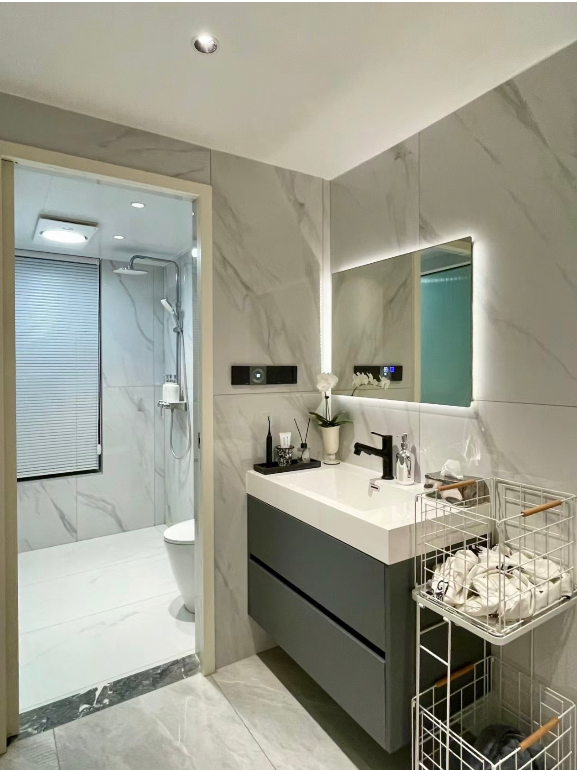 干濕二分離設(shè)計,把浴室柜區(qū)分出來,提醒不要做半墻設(shè)計,空出20cm靈活擺放這樣原來的狹窄走廊就寬松很多了浴室設(shè)計馬桶區(qū)和淋浴區(qū)