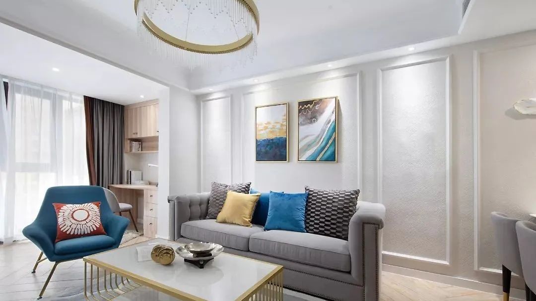 藍色用于單人座椅 抱枕及裝飾畫之上 令層次感得以突出 穿插少許奢華的金色點綴空間 整體色調(diào)更加豐富