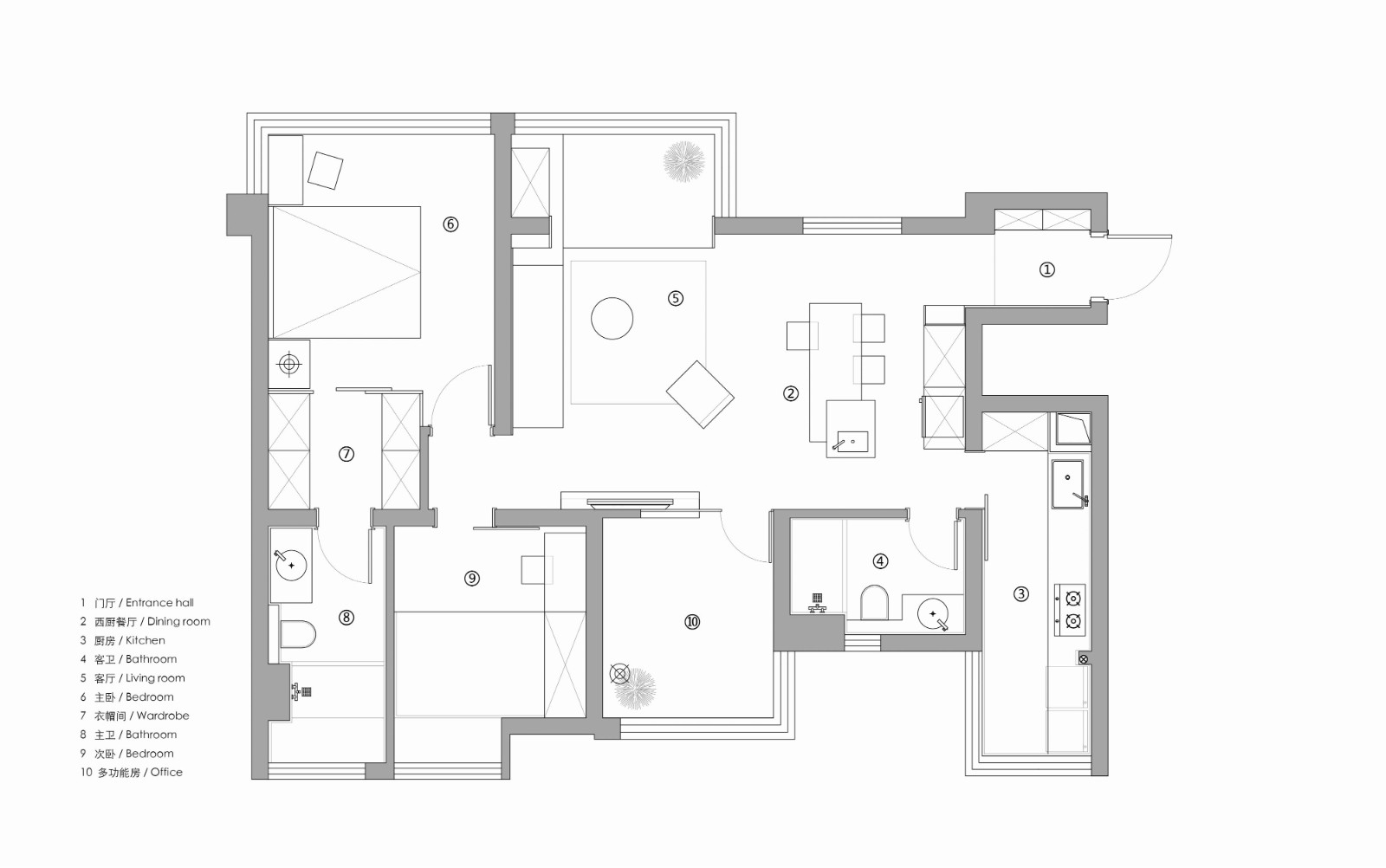 在這樣的空間中, 家具被弱化,這些空間的構(gòu)件(功能與裝飾)都“退化”于空間的基礎(chǔ)層。在這個(gè)棱角分明的空間在幾何體塊中組建家具,在體塊之間的合并與穿插中,于空間拉伸出一個(gè)平靜的場(chǎng)域。