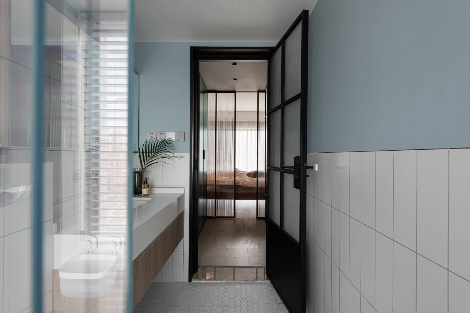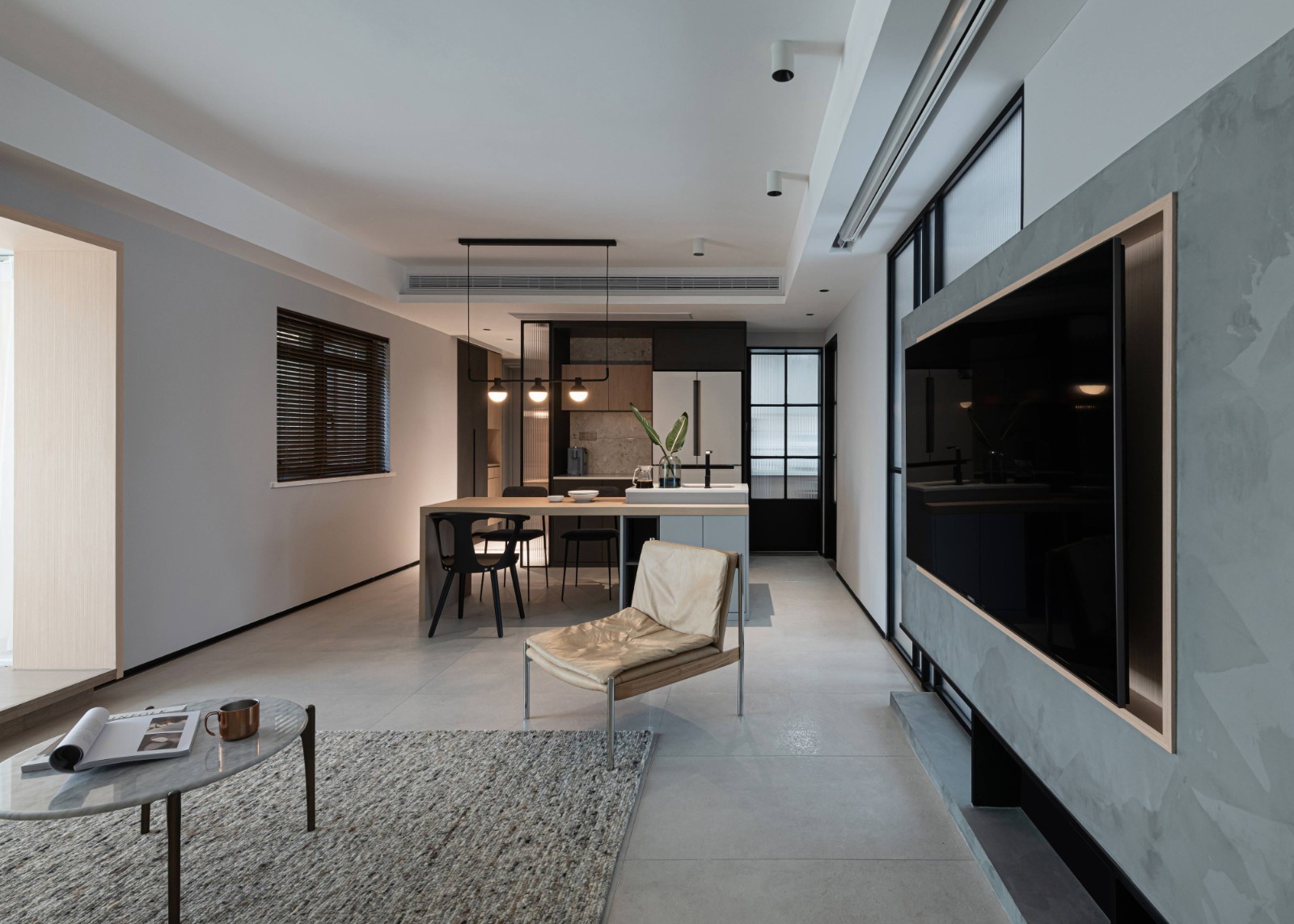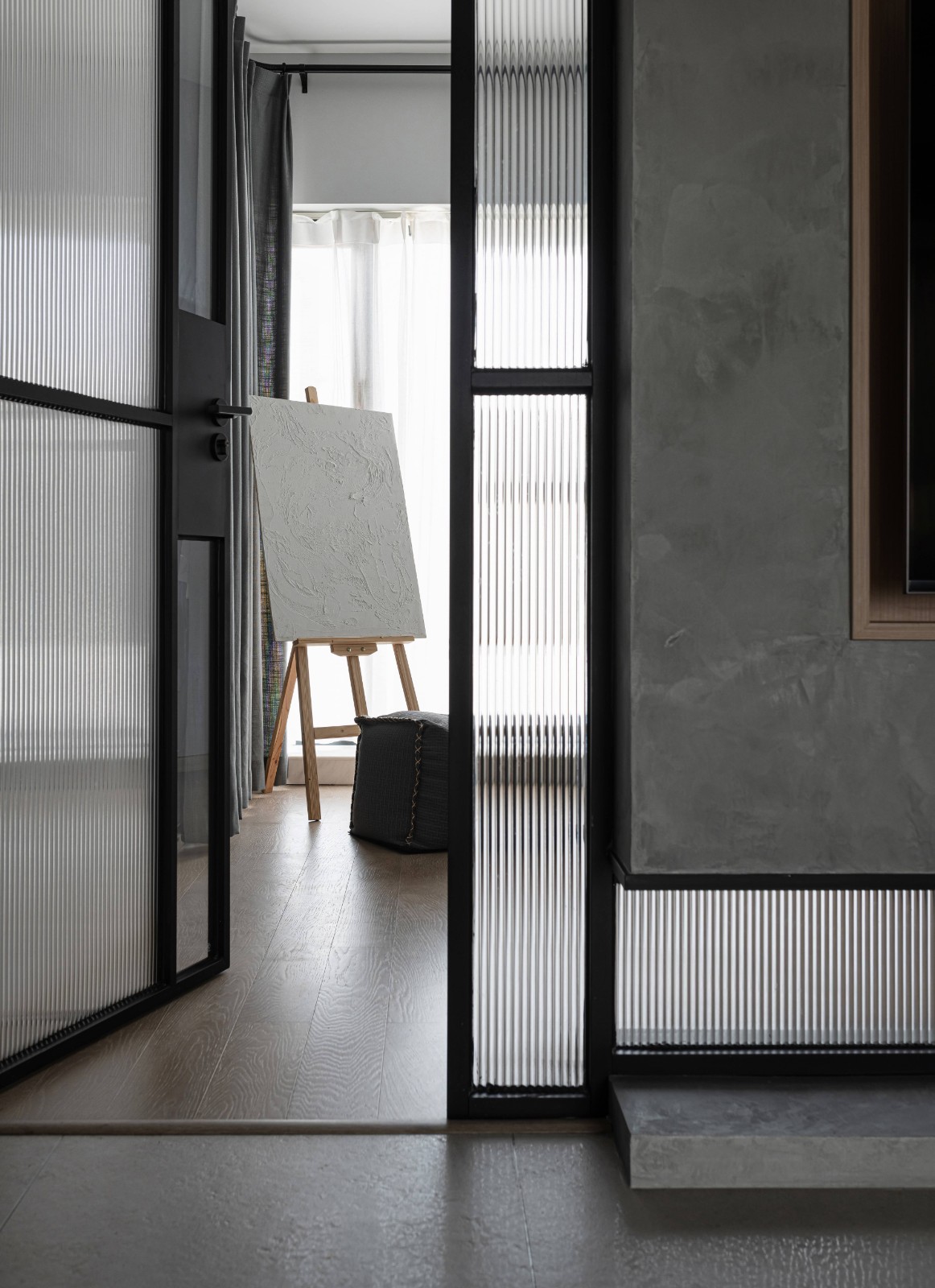 長(zhǎng)虹玻璃為空間引入光線,代表一份明亮,營(yíng)造一個(gè)敞亮的空間。作為一道可切換的界限與隔斷,也作為一個(gè)可延伸的共同聯(lián)結(jié),它沒有完全地切斷空間,而在視覺上形成一個(gè)連綿而有層次的空間。