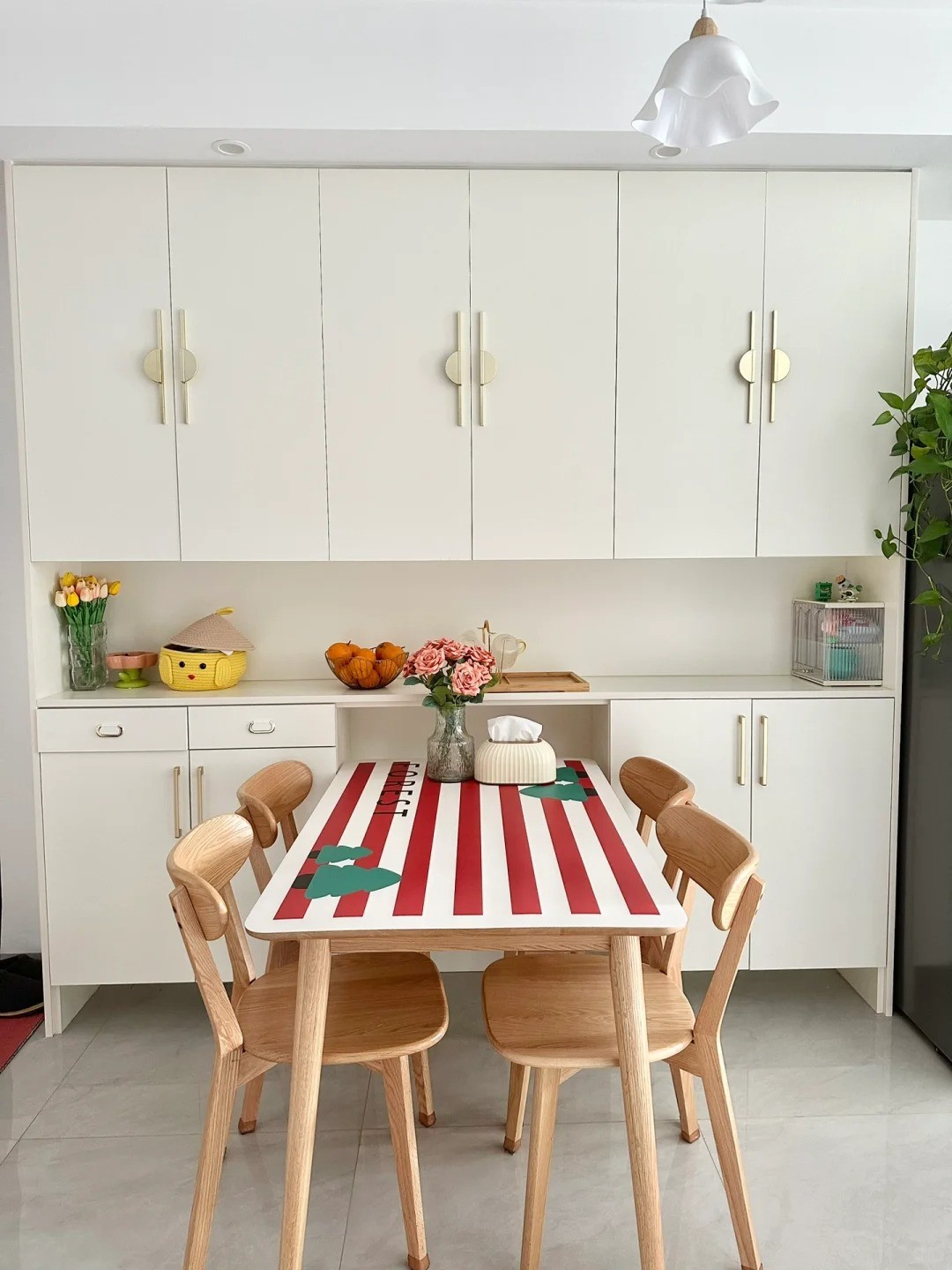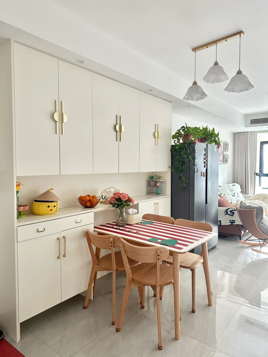 餐邊柜是做滿墻通頂?shù)?,深淺色搭配看上去很清爽。