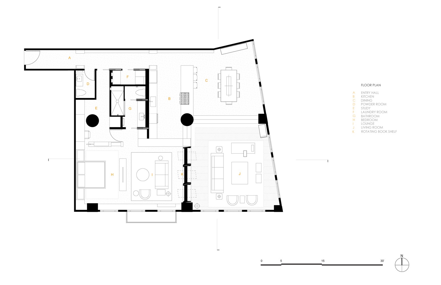三列可90度旋轉(zhuǎn)的定制書柜將起居室與臥室隔開。