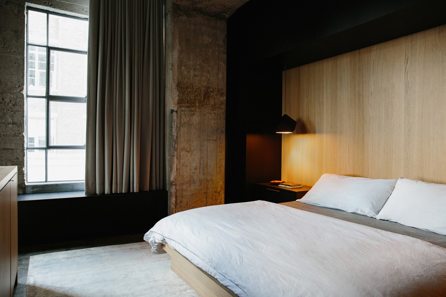 水泥地面和暴露在外的結(jié)構(gòu)混凝土使原有空間極具工業(yè)感,與之相對(duì)的應(yīng)是一種更親切、具有現(xiàn)代感的裝潢。