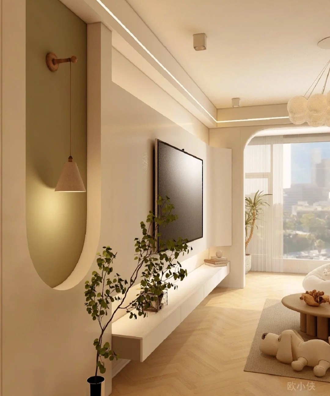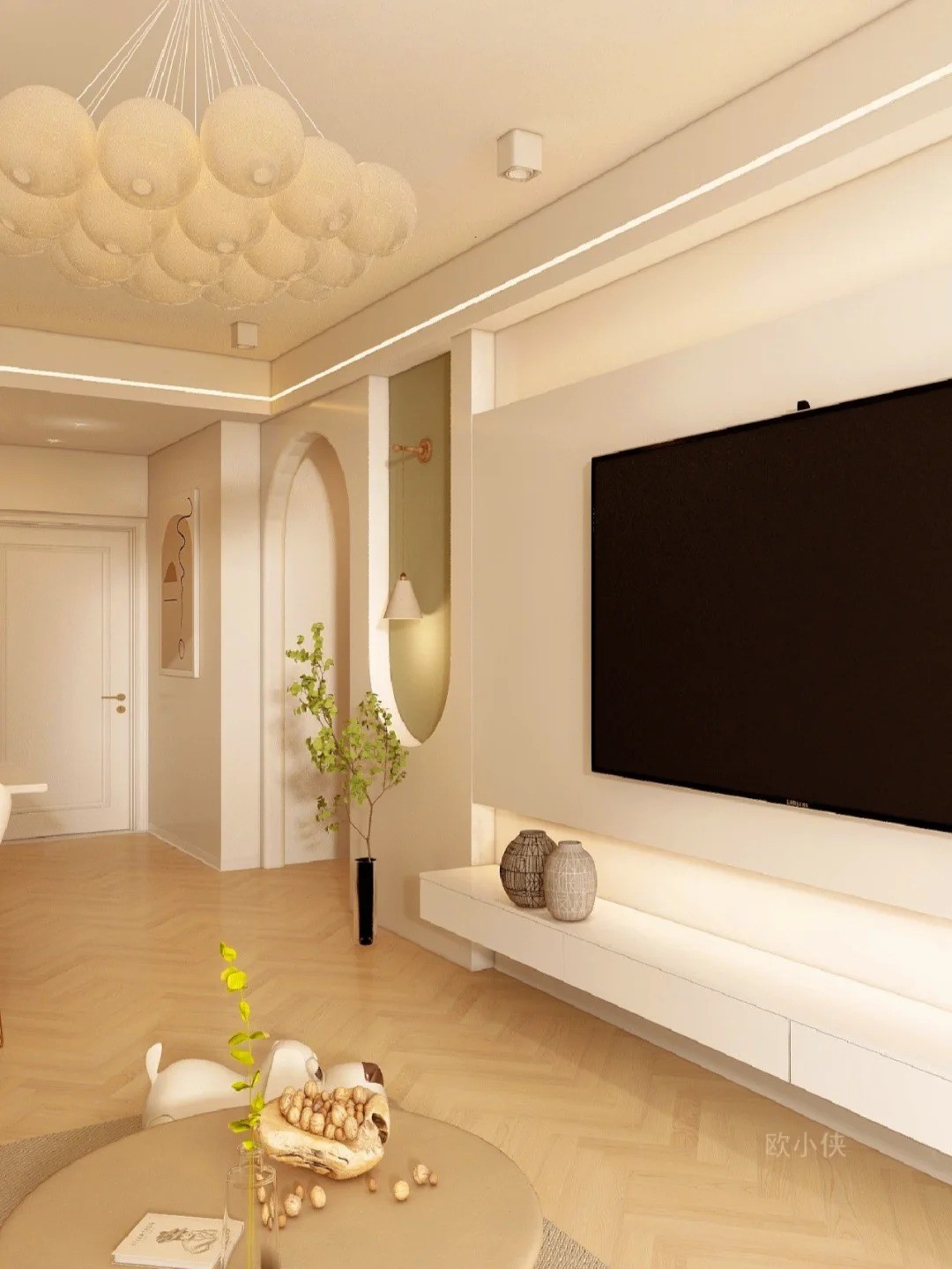 客廳雙背景墻不做過(guò)多設(shè)計(jì),墻板內(nèi)嵌燈帶,簡(jiǎn)約,很適合小戶型的設(shè)計(jì)。