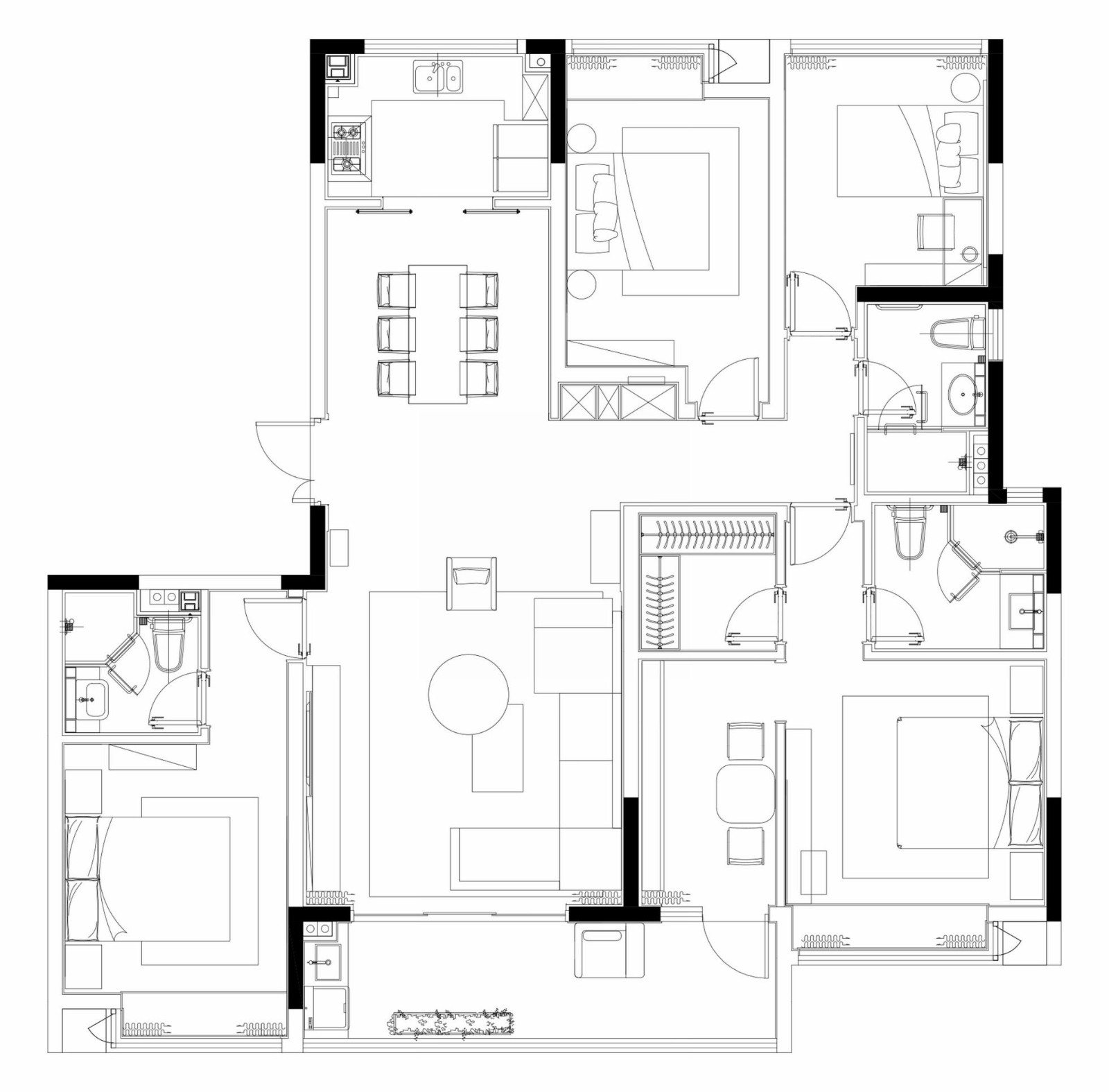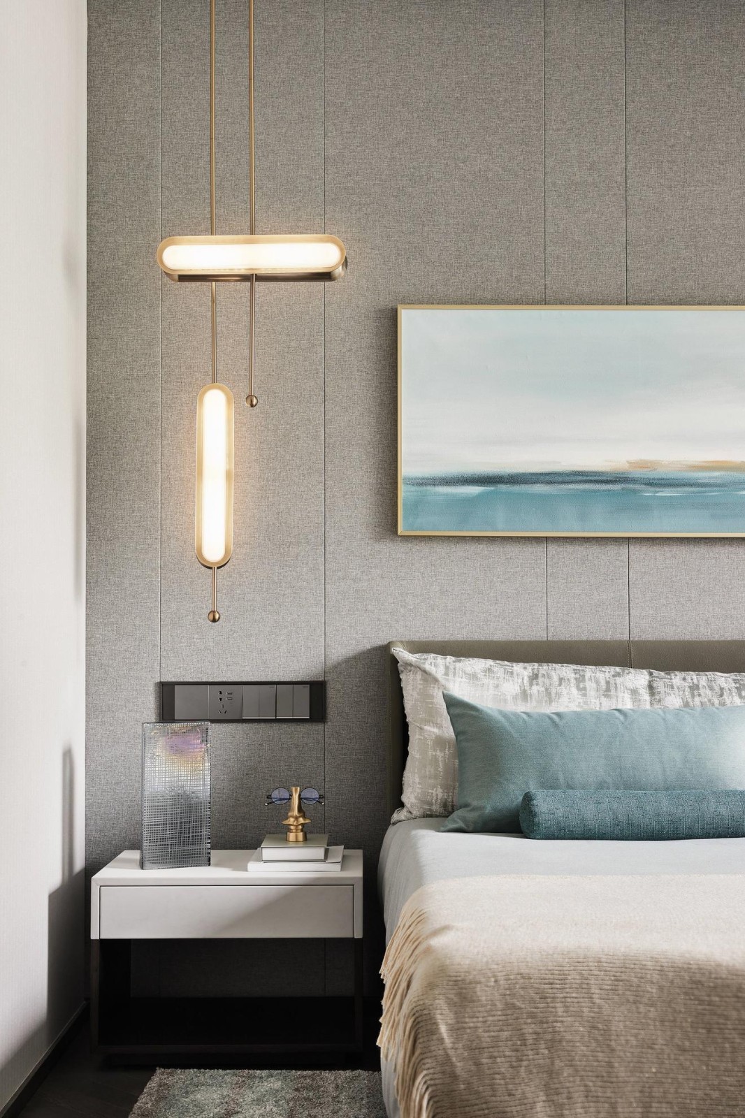 主臥套房的格調(diào)延續(xù)主設(shè)計(jì)調(diào)性,設(shè)計(jì)觀照點(diǎn)滴日常的豐富性,以高品質(zhì)的床具部品展呈生活的精致感,以造型別奇的燈飾搭建節(jié)奏韻律,借細(xì)膩生動(dòng)的水彩掛畫(huà)點(diǎn)綴空間如詩(shī)的美。
