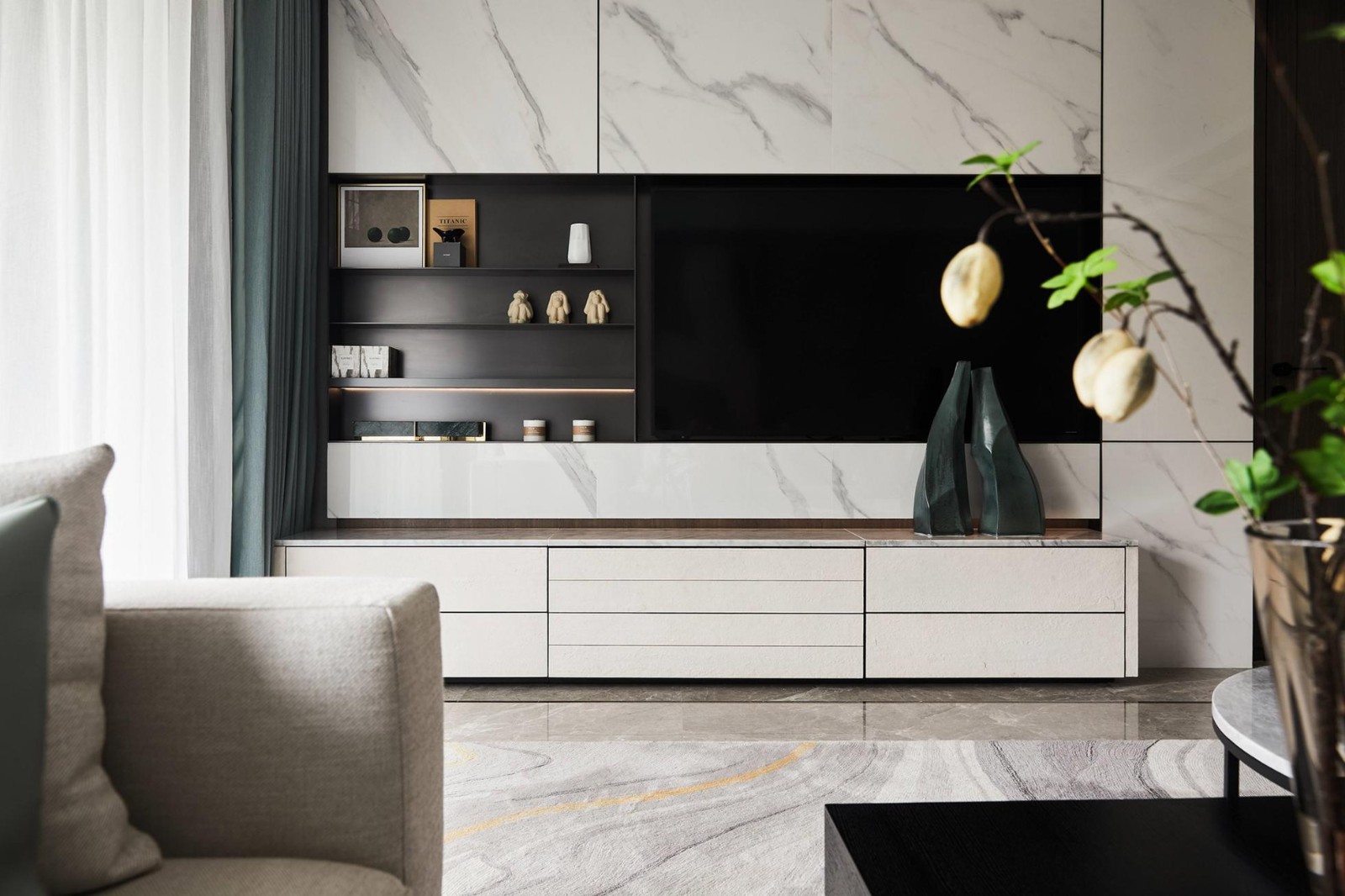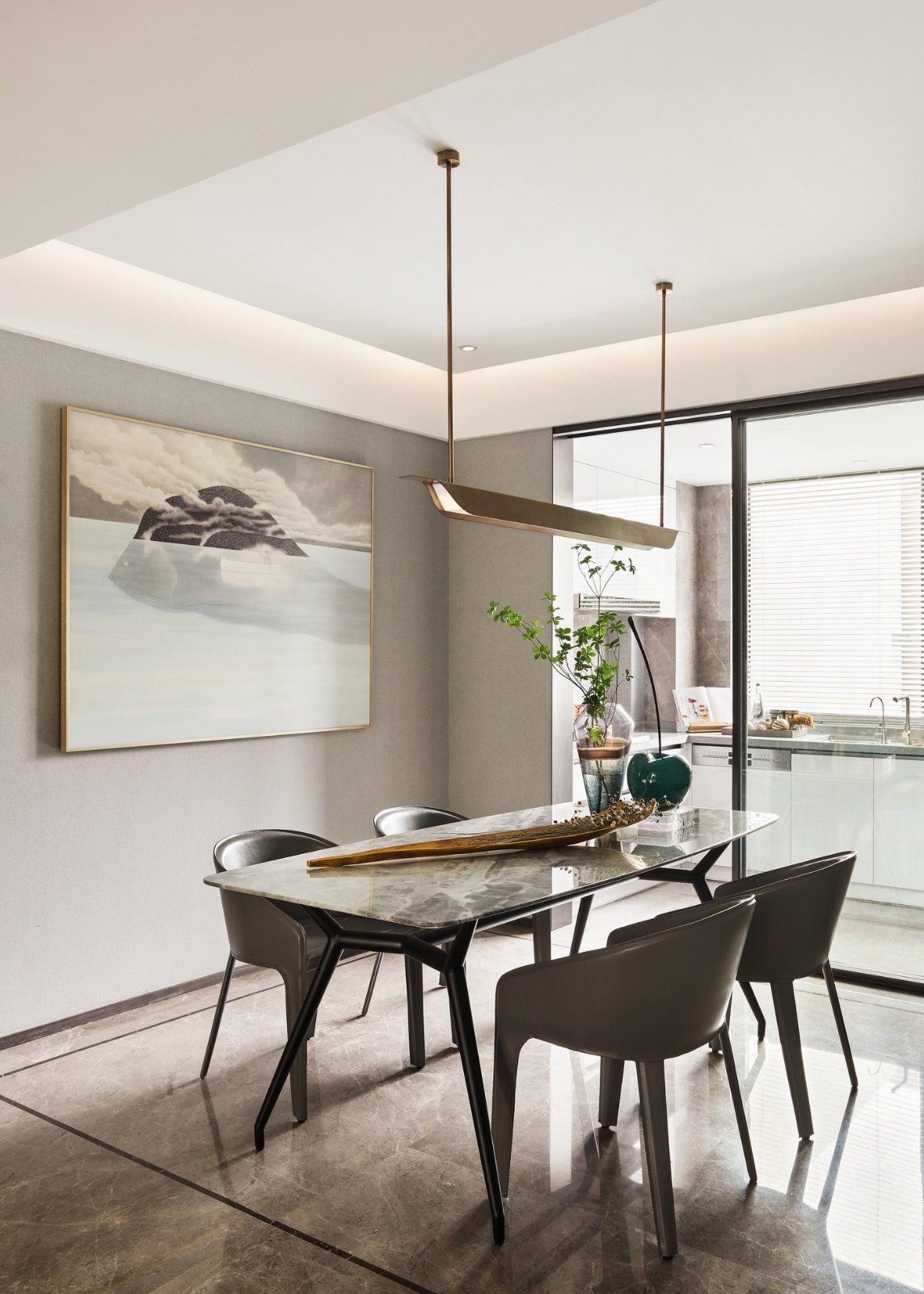 客廳空間在整體極簡(jiǎn)和雅的氣質(zhì)中,不同層次的青、白、灰色和諧相融;軟包、瓷板、皮料等現(xiàn)代風(fēng)格材質(zhì),構(gòu)塑空間高雅大氣的當(dāng)代調(diào)性。