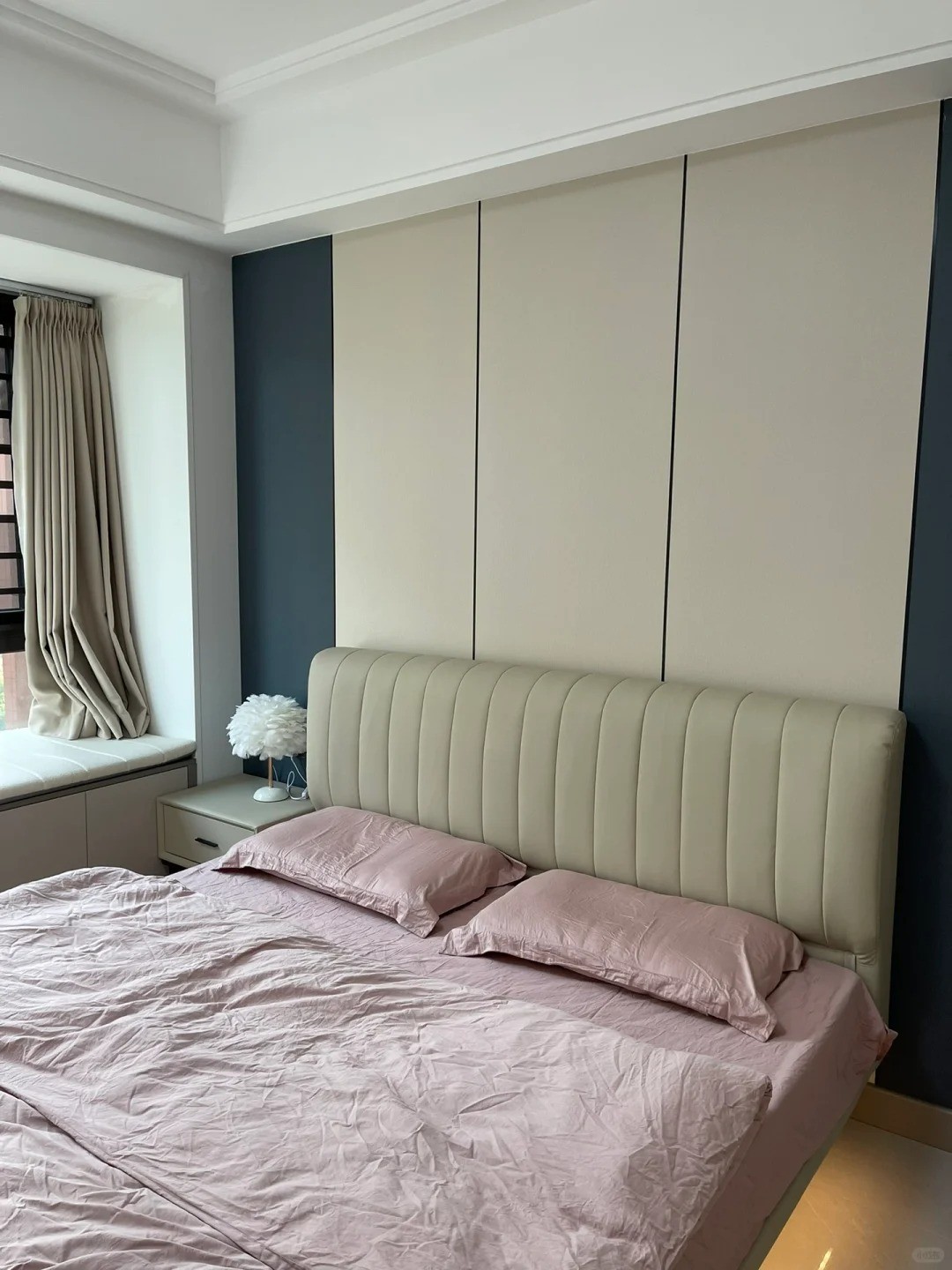 臥室的設計會更加的活潑、可愛一些,淺灰色的墻面和原木風的家具、粉色的床品組成了這樣一個簡單、溫馨而又浪漫的空間。