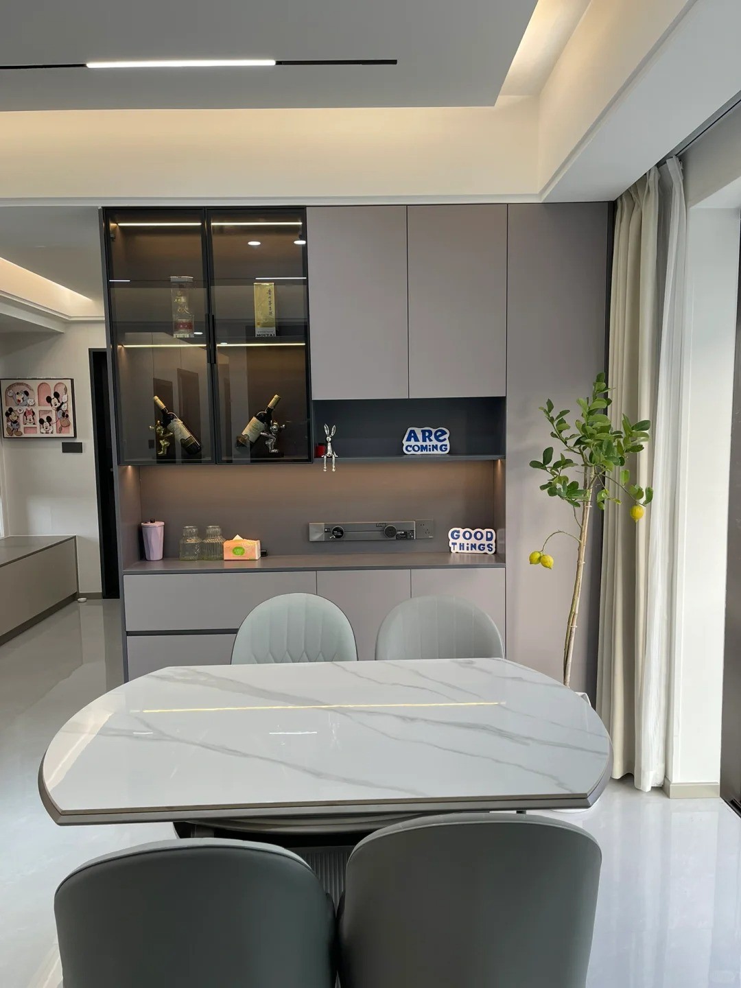 餐廳布置了一張方形巖板材質(zhì)的餐桌,占用的空間大小位置合適,需要挪動位置方便很多。搭配的灰色餐椅,顏值很高,坐著很舒服人多的時候,可以方便挪動位置,還是蠻不錯的哈。如果空間合適的話,布置圓形餐桌,更顯得大氣。