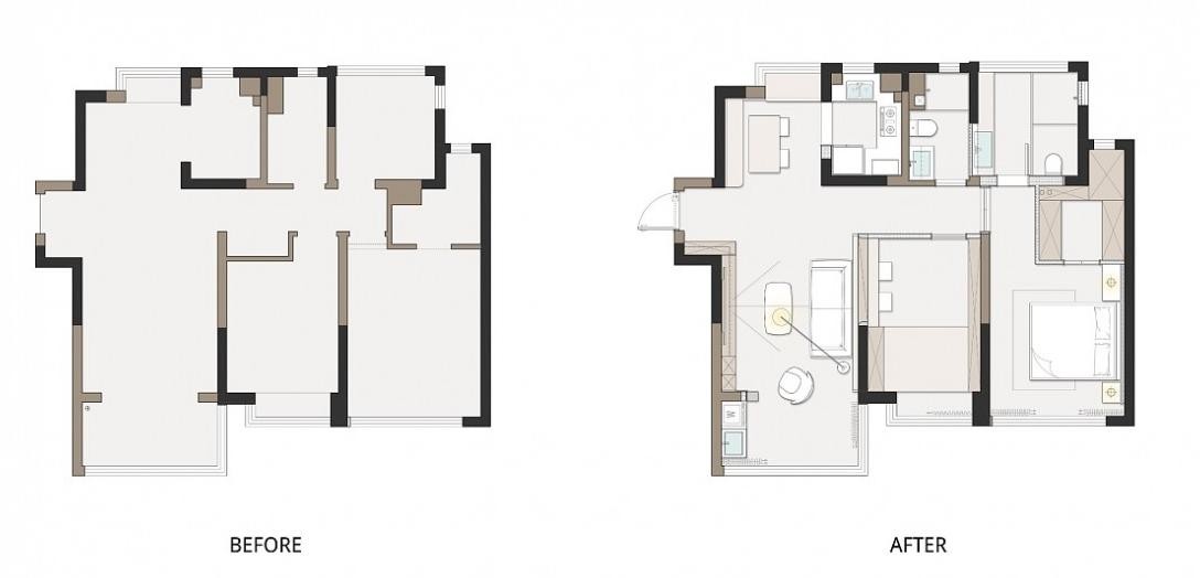 同時,拋棄流行但實用性不強的雙臺盆設(shè)計,延長臺面將其改造為梳妝臺。 從細微處,增加新生活的舒適度與品質(zhì)感。