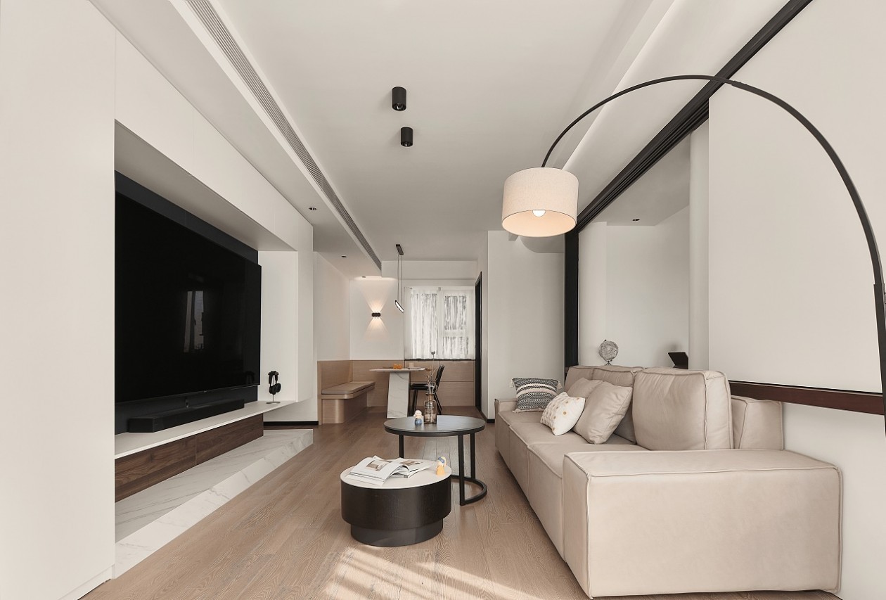客廳沙發(fā)墻虛化設(shè)計,讓身處兩個空間的家人也能進行情感的交流與陪伴。
