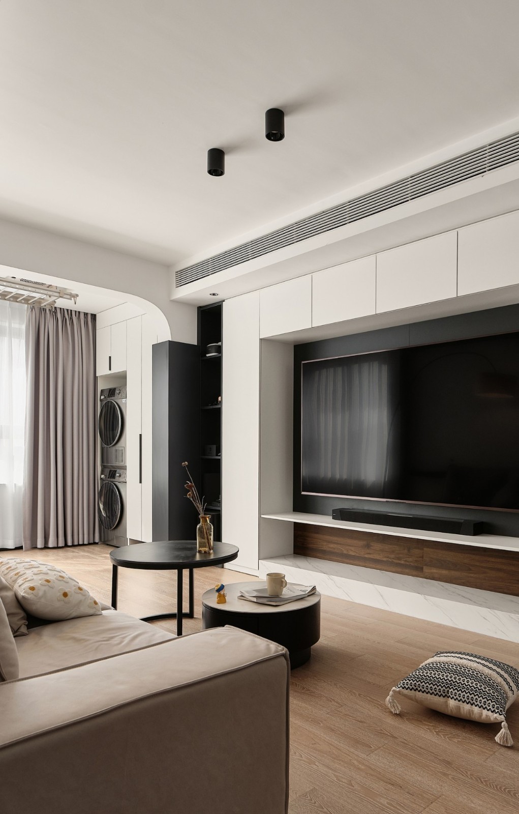 起居空間的色調(diào)以黑白為主,除去多余的裝飾設(shè)計,回歸生活的本真。 同時,引入將洗烘設(shè)備代替?zhèn)鹘y(tǒng)自然晾曬的生活新理念,將陽臺區(qū)域釋放,形成大舒適的居住體驗。