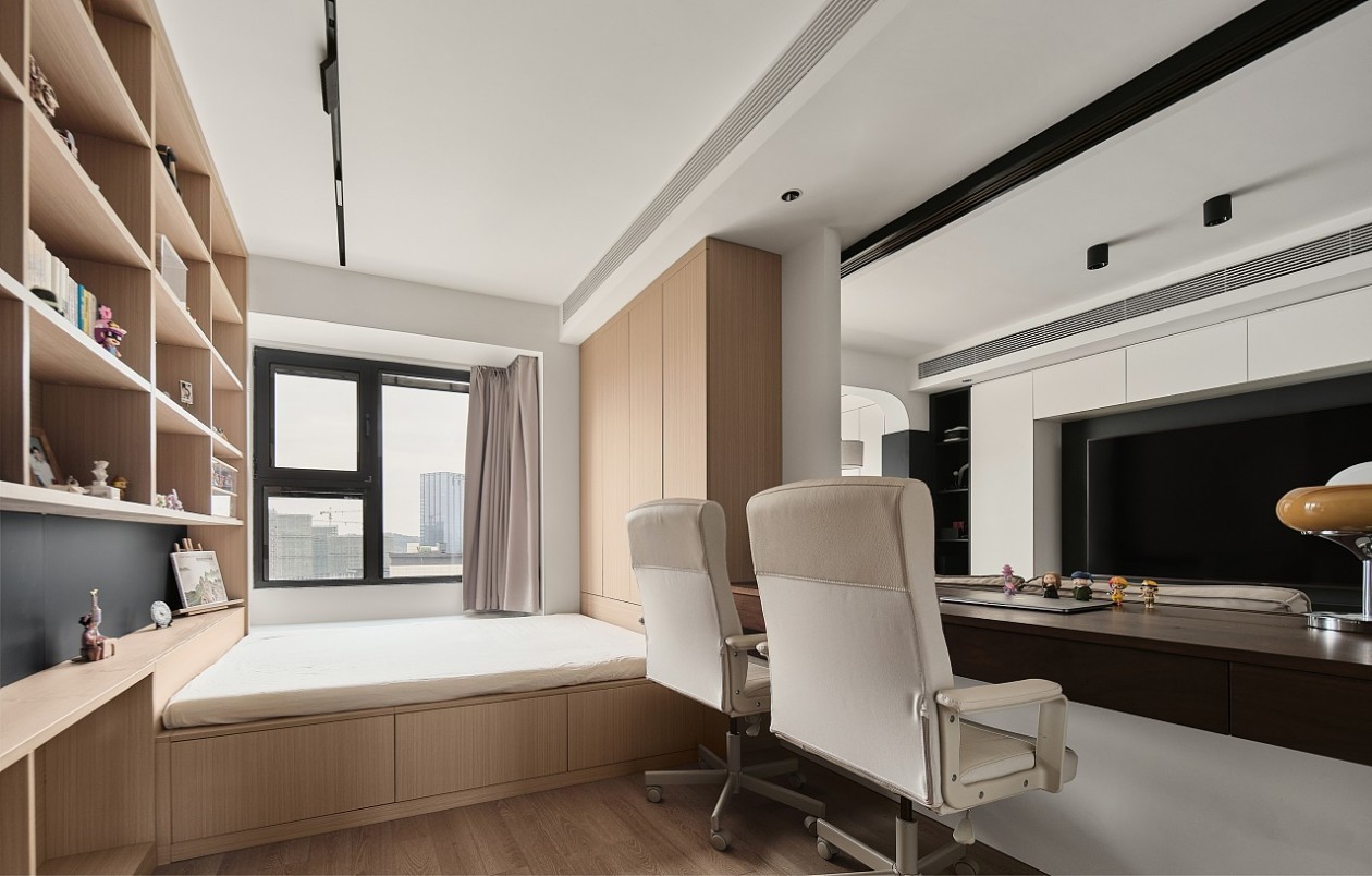 “室內(nèi)窗”的設(shè)計讓人身處書房辦公的同時,與起居室中的家人也能互動交流,開合之間是不一樣的天地。