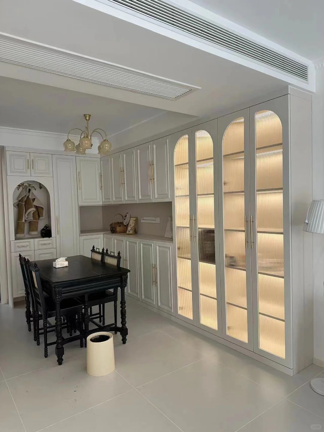 高顏值的餐廳設(shè)計,沿墻設(shè)計儲物柜增加收納,弧形元素的多處運用,彰顯居者的高雅品味,與濃濃的浪漫氣息.