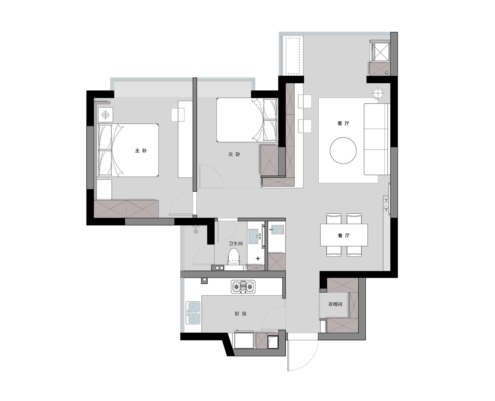 客廳和書房兩個功能區(qū)合二為一,彼此獨(dú)立又互相依存的空間關(guān)系里既要滿足工作區(qū)域的辦公學(xué)習(xí)又要考慮客廳區(qū)域的視覺美觀,如何兼具現(xiàn)代的設(shè)計感和空間的實用性是本案設(shè)計的重點。原始兩房兩廳的戶型比較規(guī)整,結(jié)合業(yè)主的需求保留兩臥但缺乏書房功能。在保證基本需求的情況下,設(shè)計師對戶型進(jìn)行了部分調(diào)整。