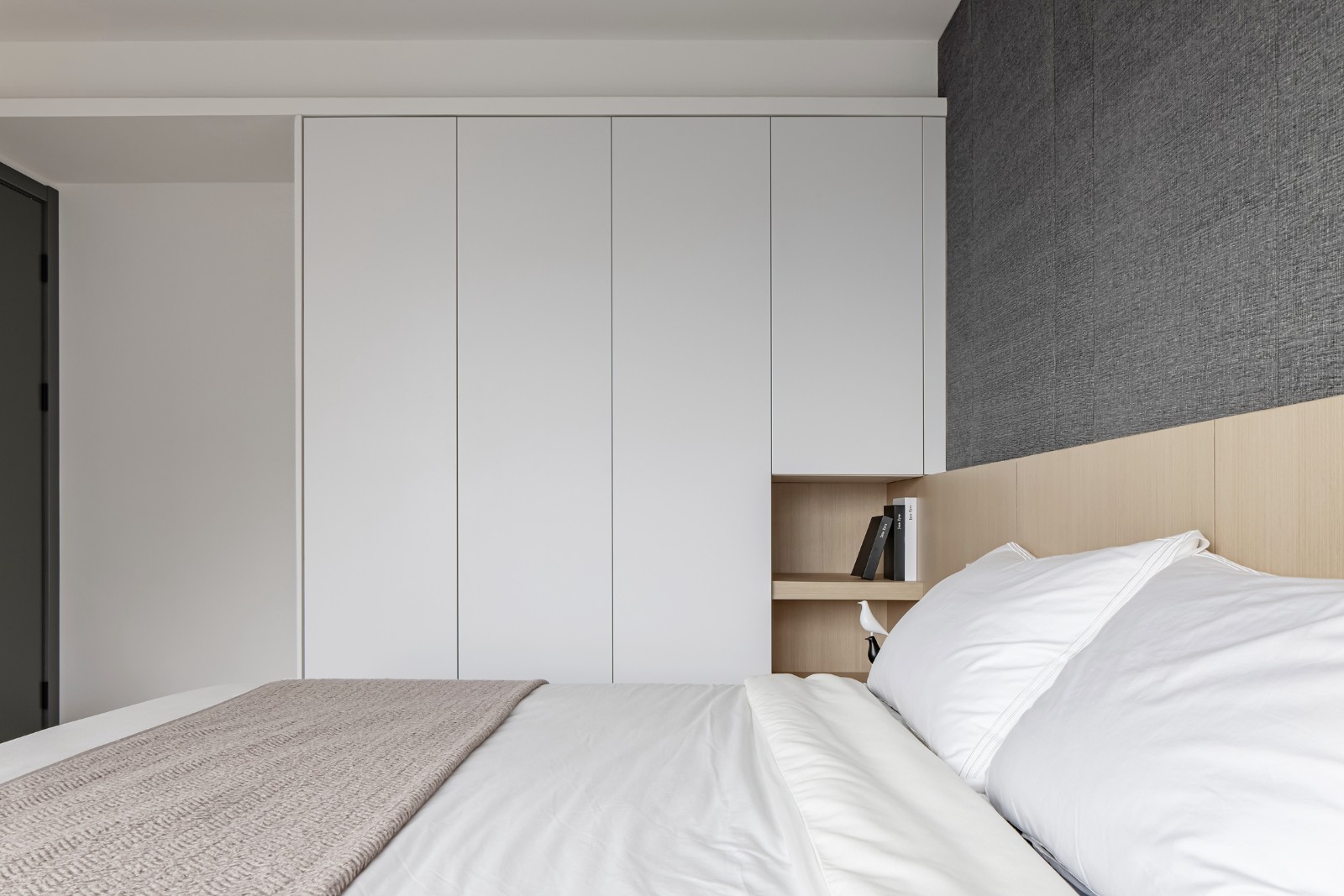 灰白木的基調(diào)展現(xiàn)自然淡泊的質(zhì)樸之美,營造既高冷又溫馨的空間氛圍。貼合墻面無靠背的床頭設(shè)計,用簡約的硬包配合木飾面墻板做背景,空間看起來更加整潔更顯品質(zhì)。