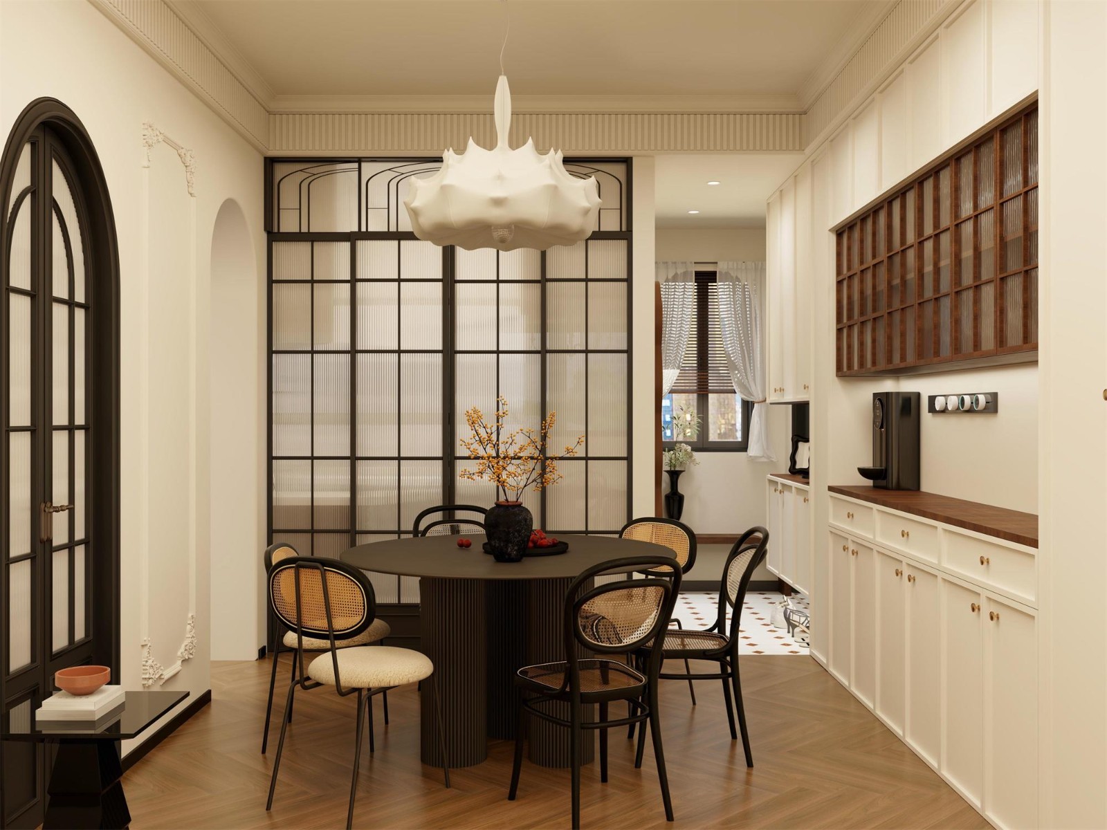 在餐廳里,一張實(shí)木大圓桌與優(yōu)雅的藤編椅相得益彰,而頂部懸掛著一盞精美的蠶絲吊燈,為整個空間增添了一絲溫馨的氛圍。