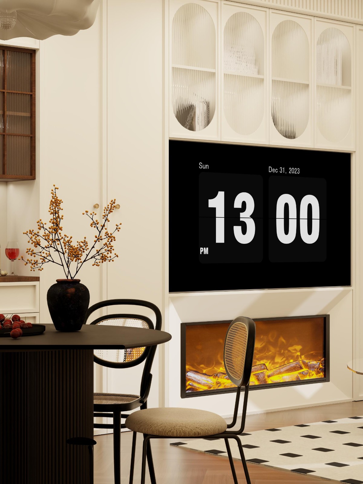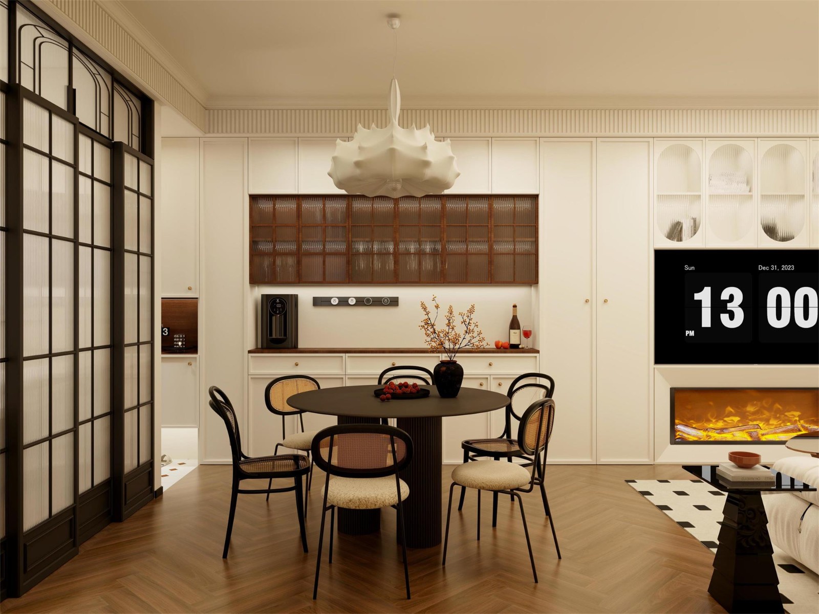 客廳整體法式古風(fēng),設(shè)計客餐廳一體式合理利用空間,電視背景劃分三個區(qū)域:左上方收納柜,中間電視機(jī),下方電子壁爐,顏值爆表