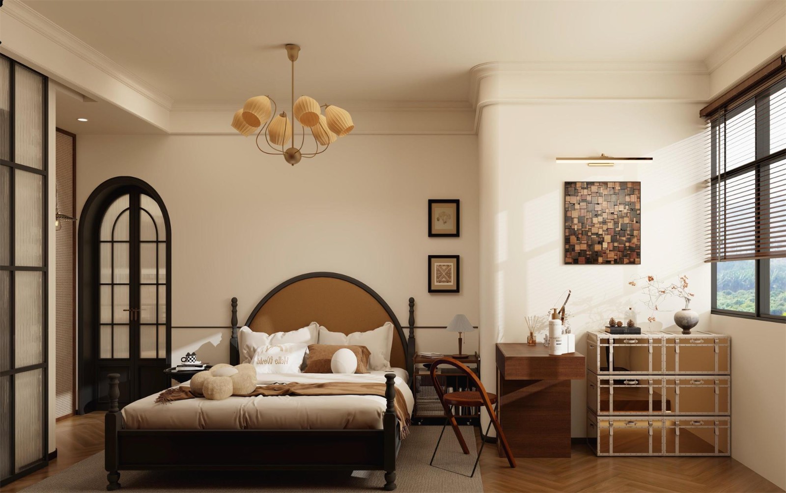 主臥室延續(xù)了法式復(fù)古風(fēng)格, 法式復(fù)古半圓靠背實(shí)木床、木紋做舊的藝術(shù)掛畫和玫瑰金不銹鋼收納柜,營造出濃厚的復(fù)古氛圍。 整個空間充滿了懷舊的情調(diào),仿佛穿越回了優(yōu)雅的舊時光。