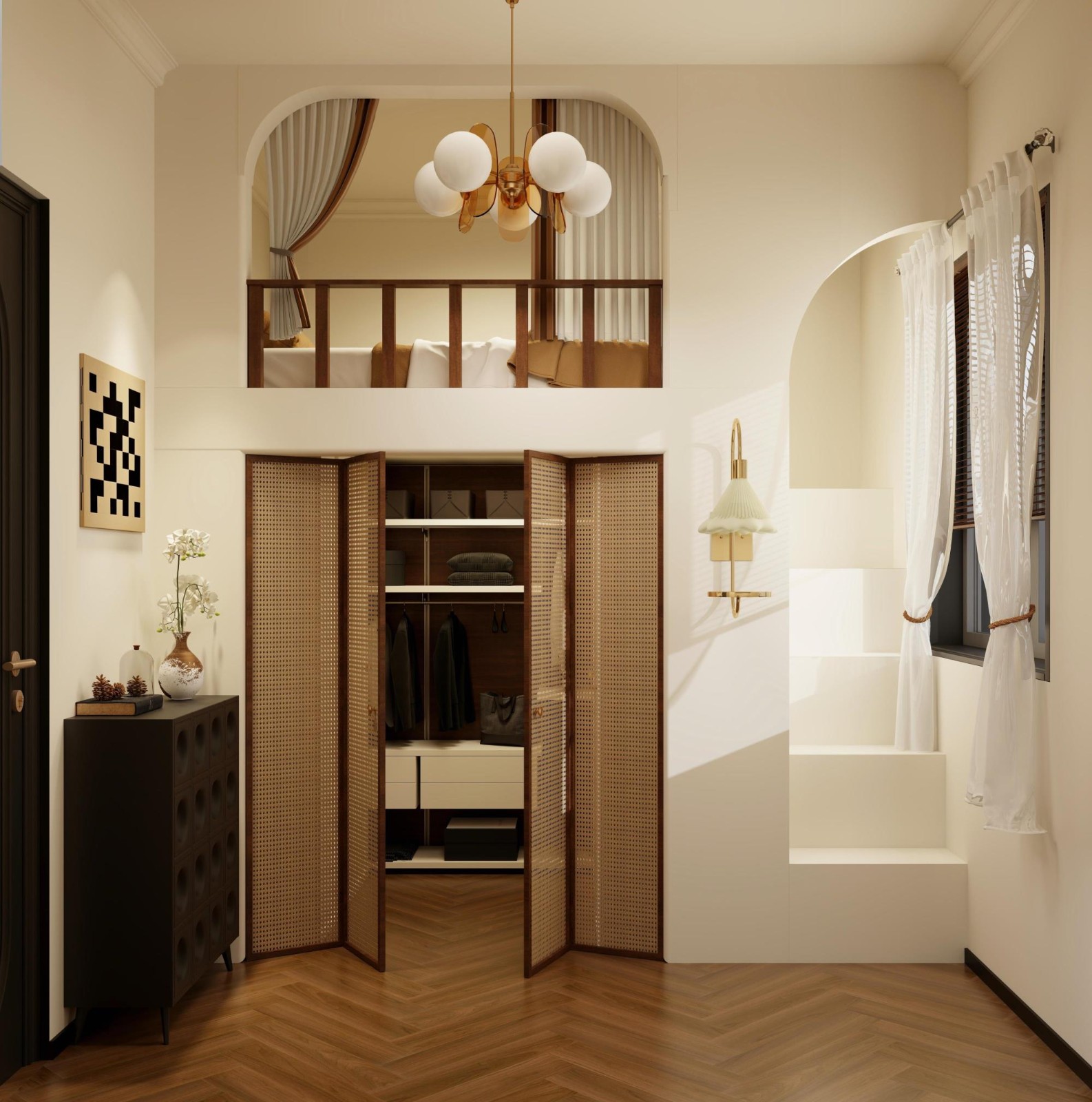 次臥面積為7平方米,經(jīng)過設(shè)計后呈現(xiàn)出充滿復(fù)古風(fēng)情的小樹屋。上方被打造成一個舒適的休息區(qū),下方則巧妙地設(shè)置了衣物收納區(qū)。