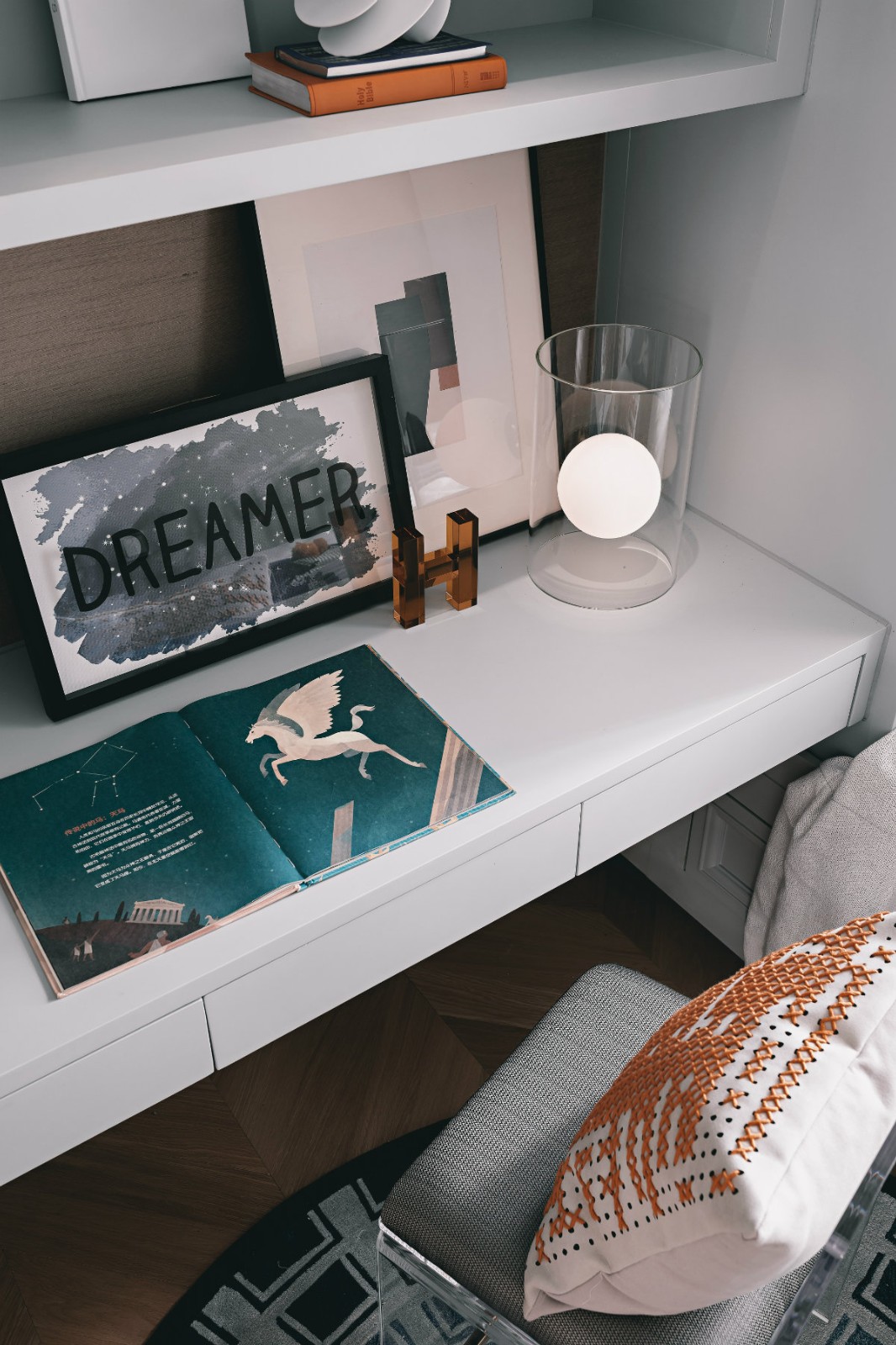 書房體現(xiàn)了一種唯想主義美學(xué)論,將古典建筑的主次清晰、簡(jiǎn)潔、重視構(gòu)圖規(guī)律,運(yùn)用色彩再創(chuàng)感性美。