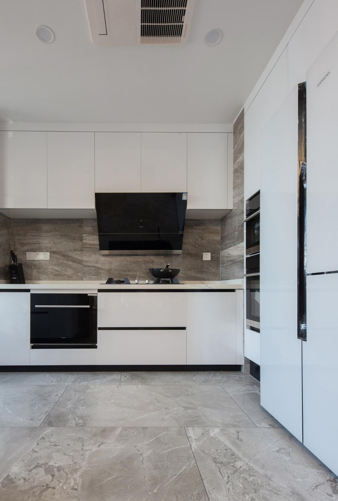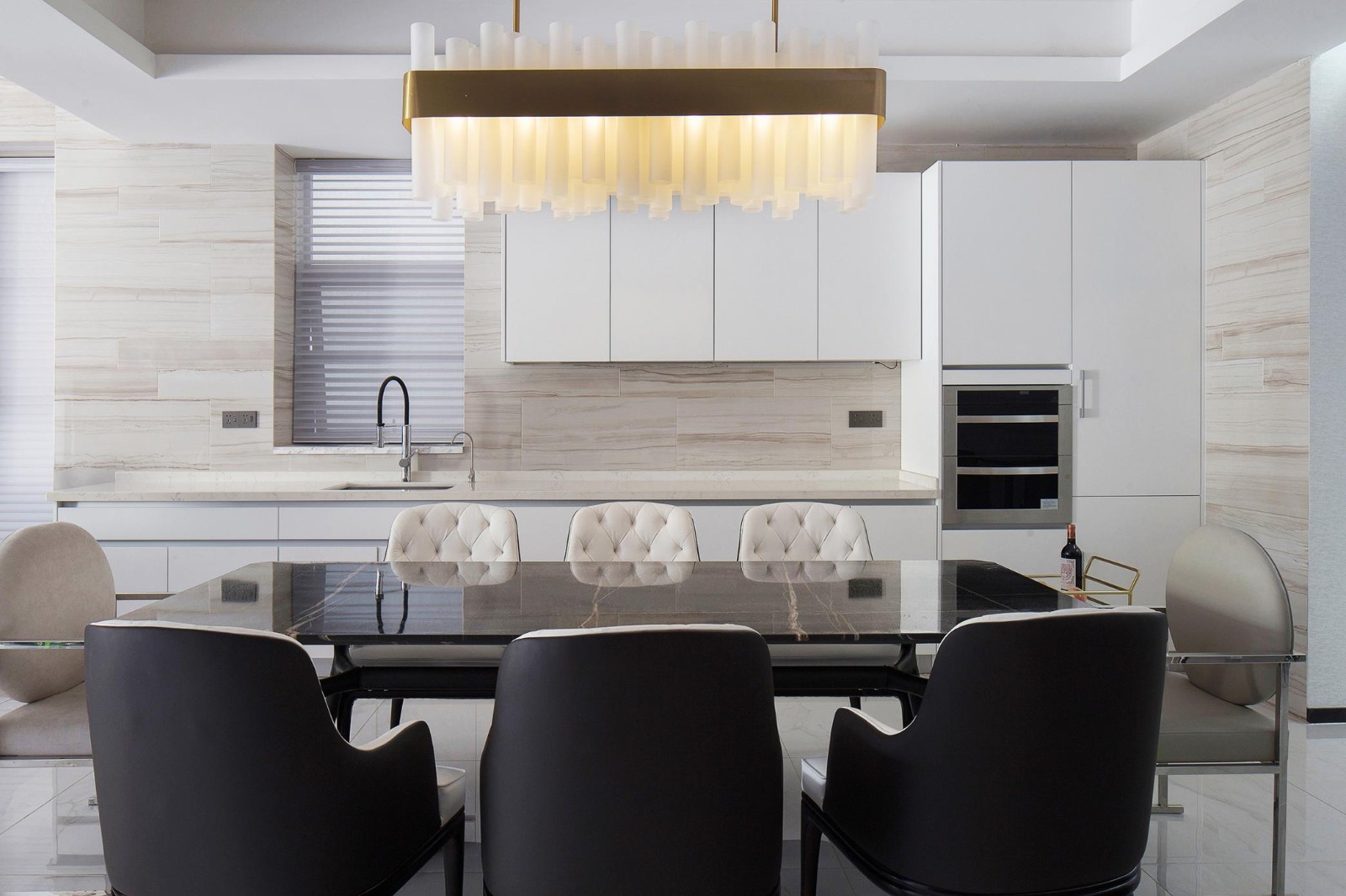 餐廚區(qū)域結(jié)合業(yè)主的用餐習(xí)慣和使用形式,將中廚、西廚、餐廳三合一,組建成一個(gè)具有社交功能的開放式區(qū)域。
