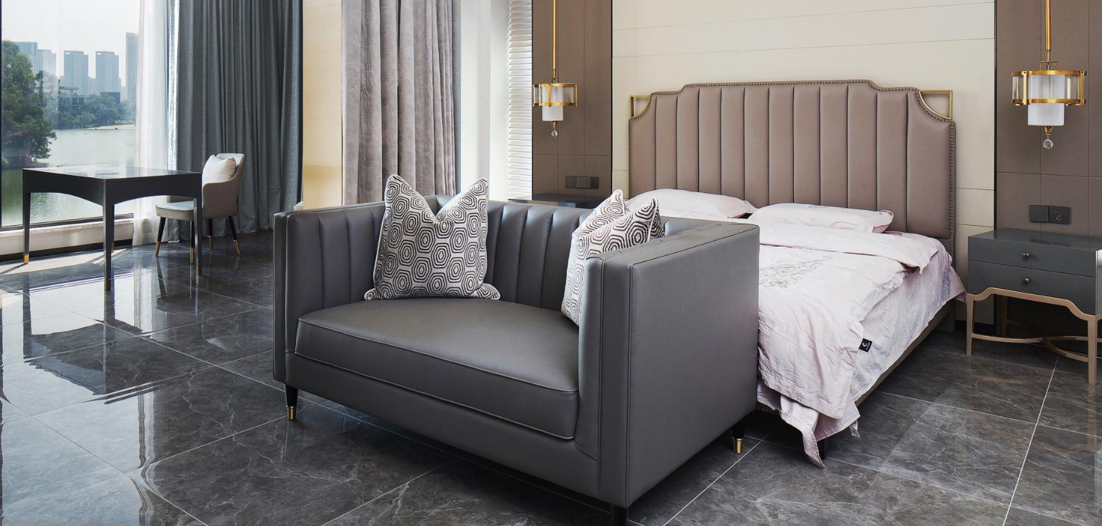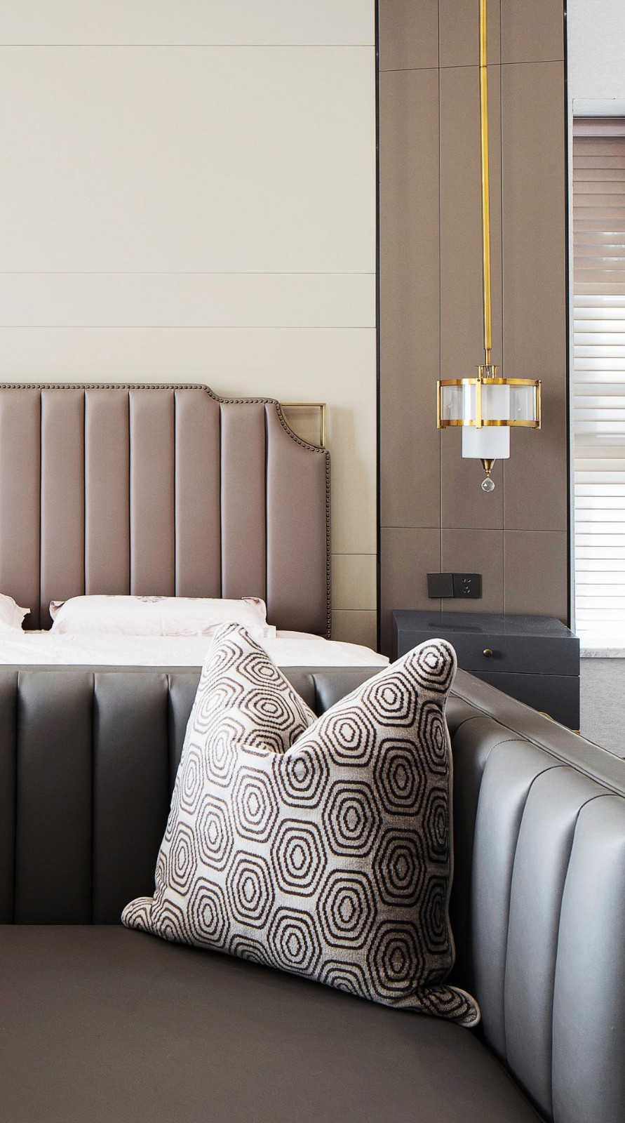 主臥典雅大氣,選用米色、駝色等暖色與灰相搭配,通過護(hù)墻板、真皮、大理石的材質(zhì)切換,使空間質(zhì)感更為飽滿。細(xì)節(jié)之處點(diǎn)綴金色光芒,自然而克制的呈現(xiàn)空間精致優(yōu)雅之感。