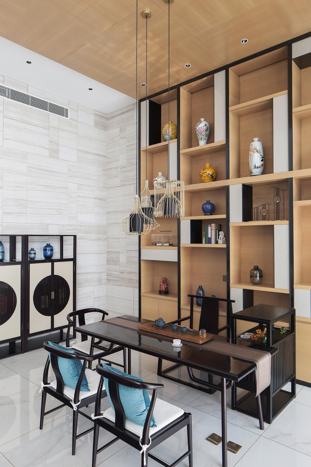 茶室以木色為主基調(diào),連通到頂?shù)臐M墻展示柜增添了空間踏實(shí)感。順著錯(cuò)落有致的展示格設(shè)計(jì),擺上三兩喜愛的擺件,輕松營(yíng)造禪意、雅致的氛圍。