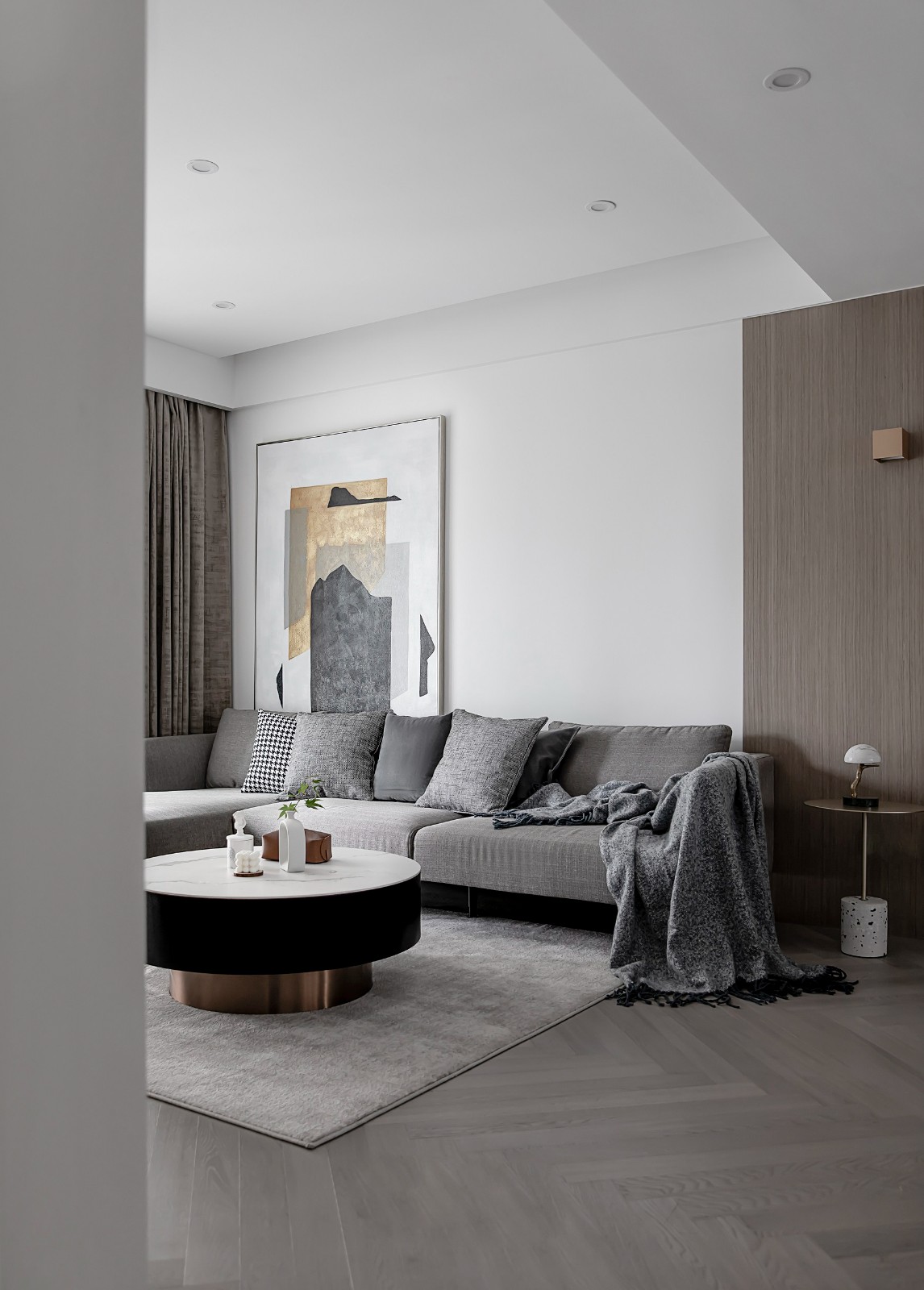 沙發(fā)背景墻留白,只用1/3的胡桃木營造溫馨氛圍,一幅抽象色塊的藝術(shù)畫提升空間格調(diào)。