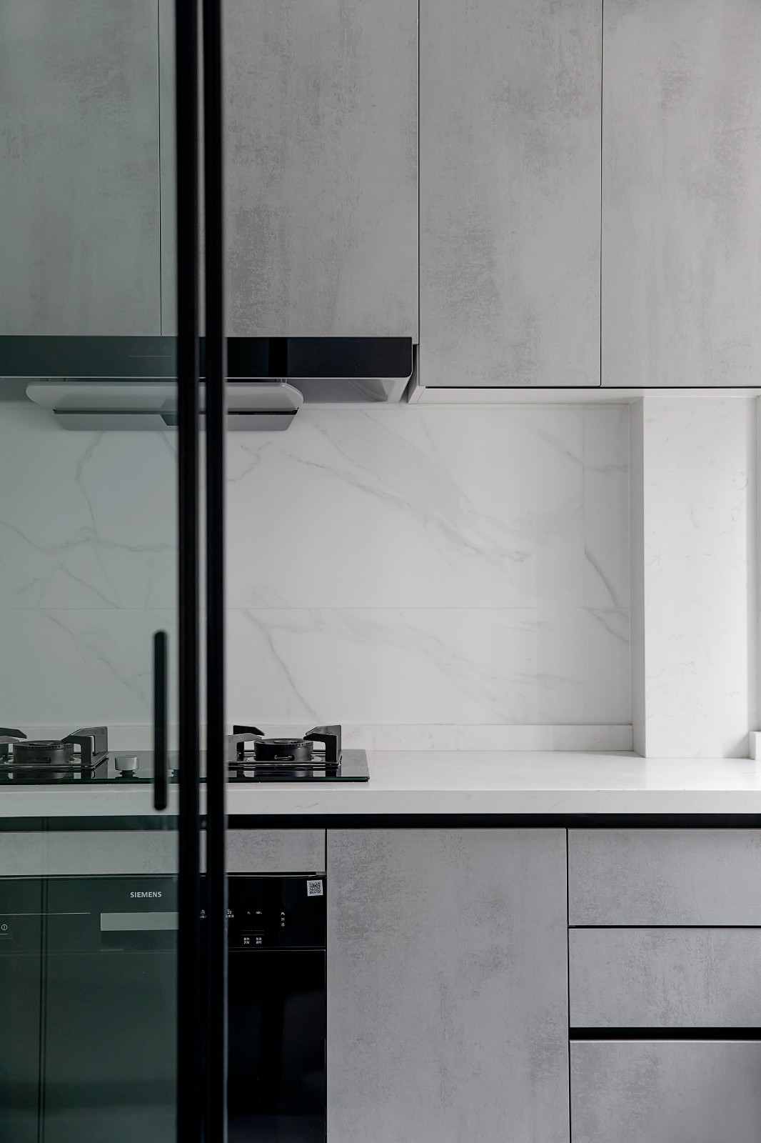中廚用透明玻璃隔絕油煙,不影響通透空間感。水泥灰的烤漆櫥柜,大氣美觀,儲物功能強(qiáng)大。