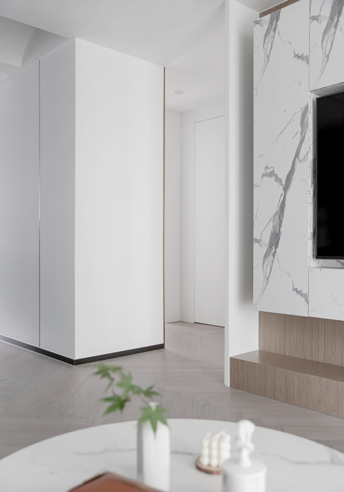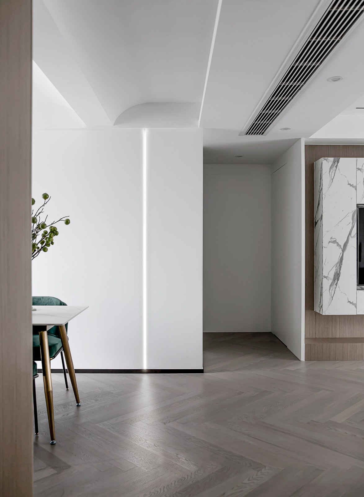 全房人字拼的木地板,將空間與空間聯(lián)絡(luò)起來。墻面線條燈光、通高隱形門,流暢利落的線條勾勒出極具現(xiàn)代感的空間輪廓。
