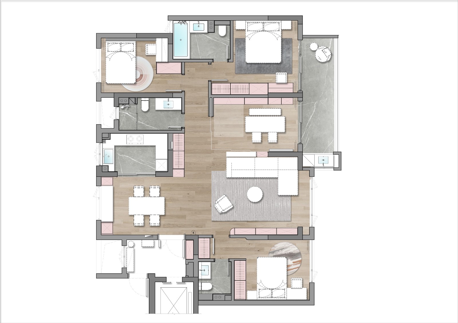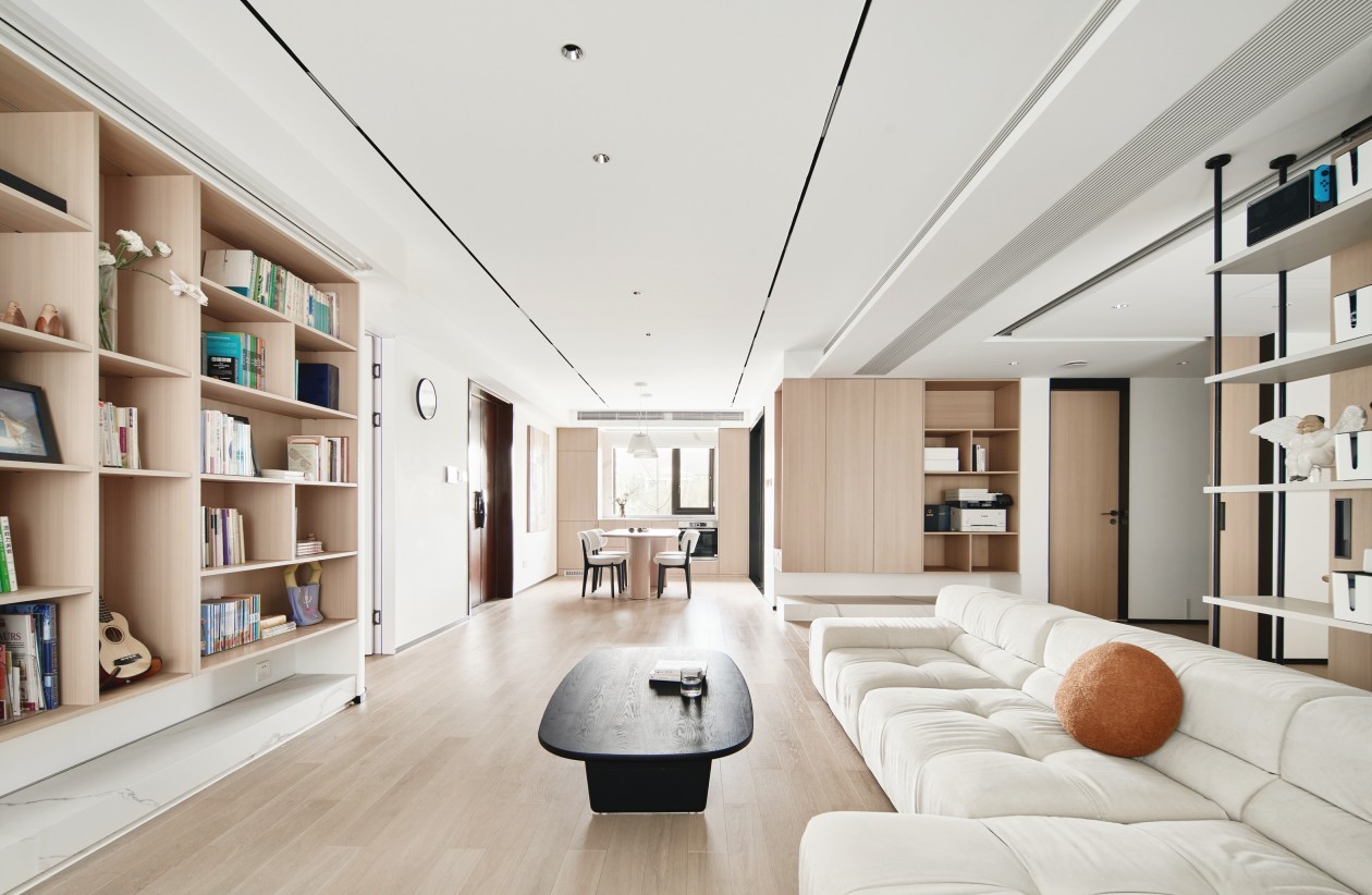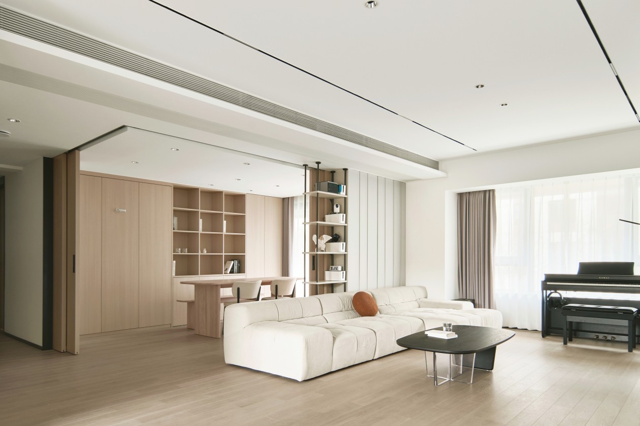 本案150㎡的平層空間圍繞中心連接互通的客餐廳空間與可伸縮敞開的多功能房展開。