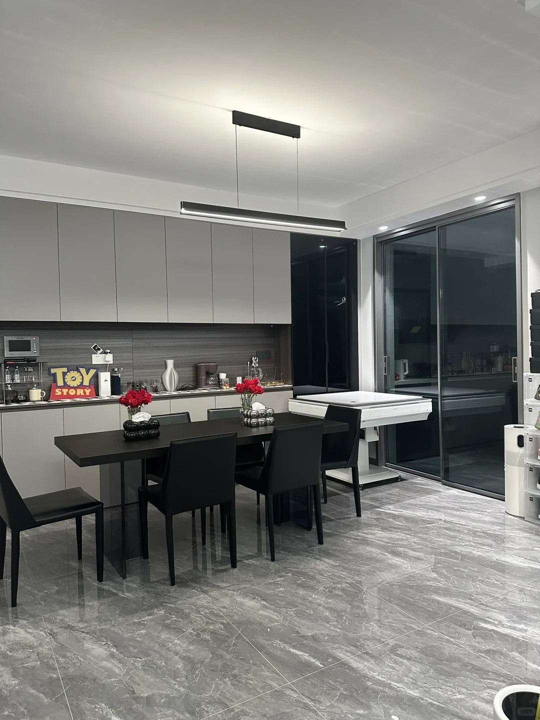 黑色餐桌搭配上黑色餐椅,和諧統(tǒng)一,色系都是統(tǒng)一的黑白灰。