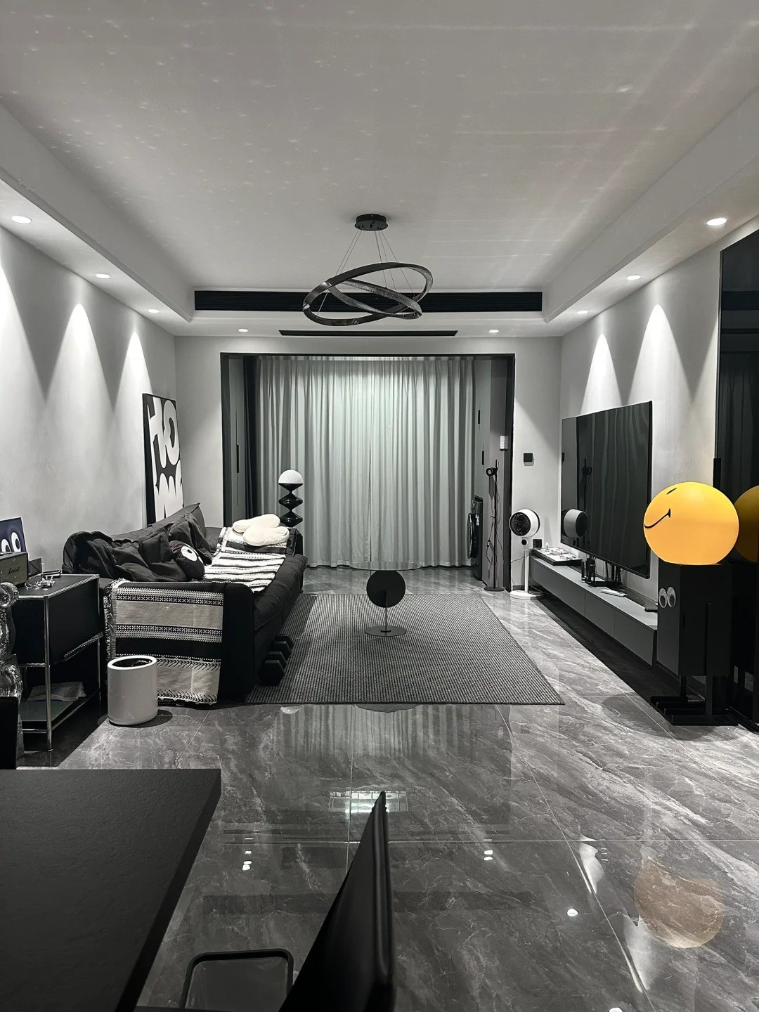 全屋亮面磚通鋪 拒絕過門石顯大 整體統(tǒng)一性還高客廳陽臺打通 不包埡口套不會有局促的線條感斗膽燈做主燈 層高不受限制全屋大白墻 干凈亮堂全屋黑色4cm實木極窄踢腳線避免占用空間,無任何復雜背景墻