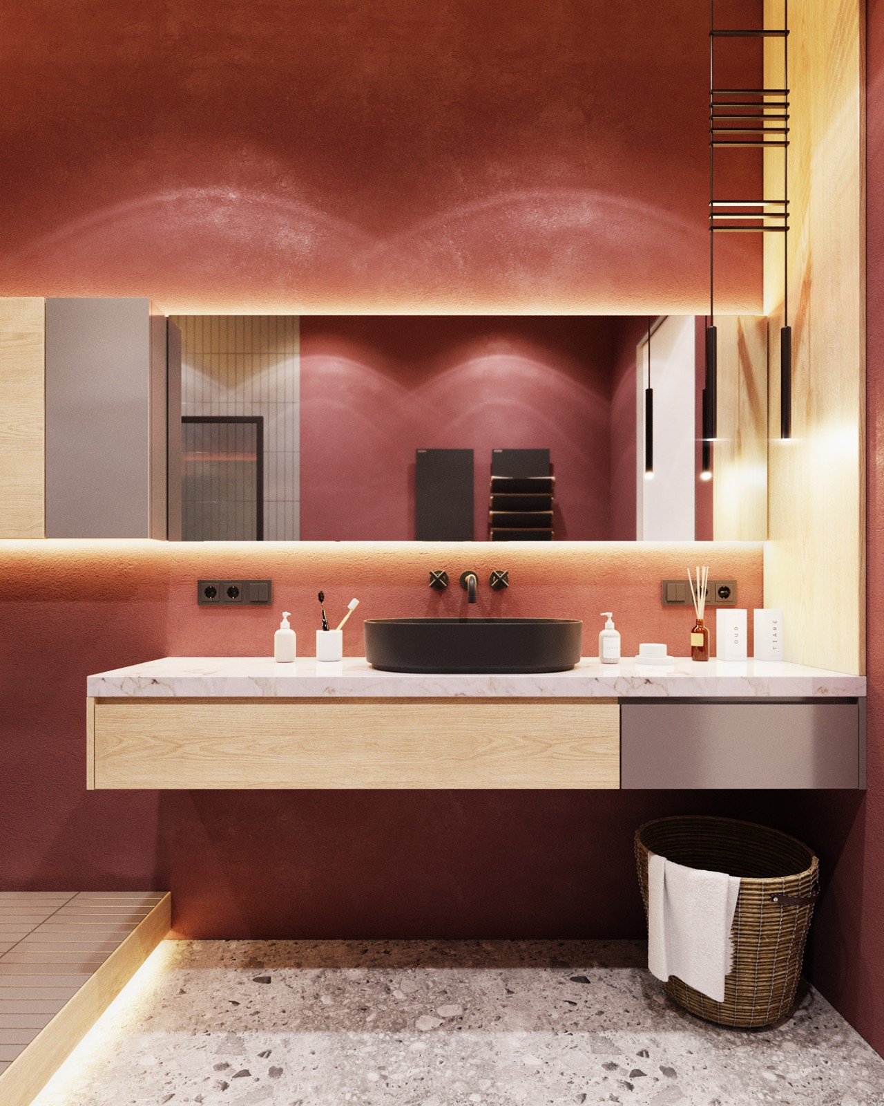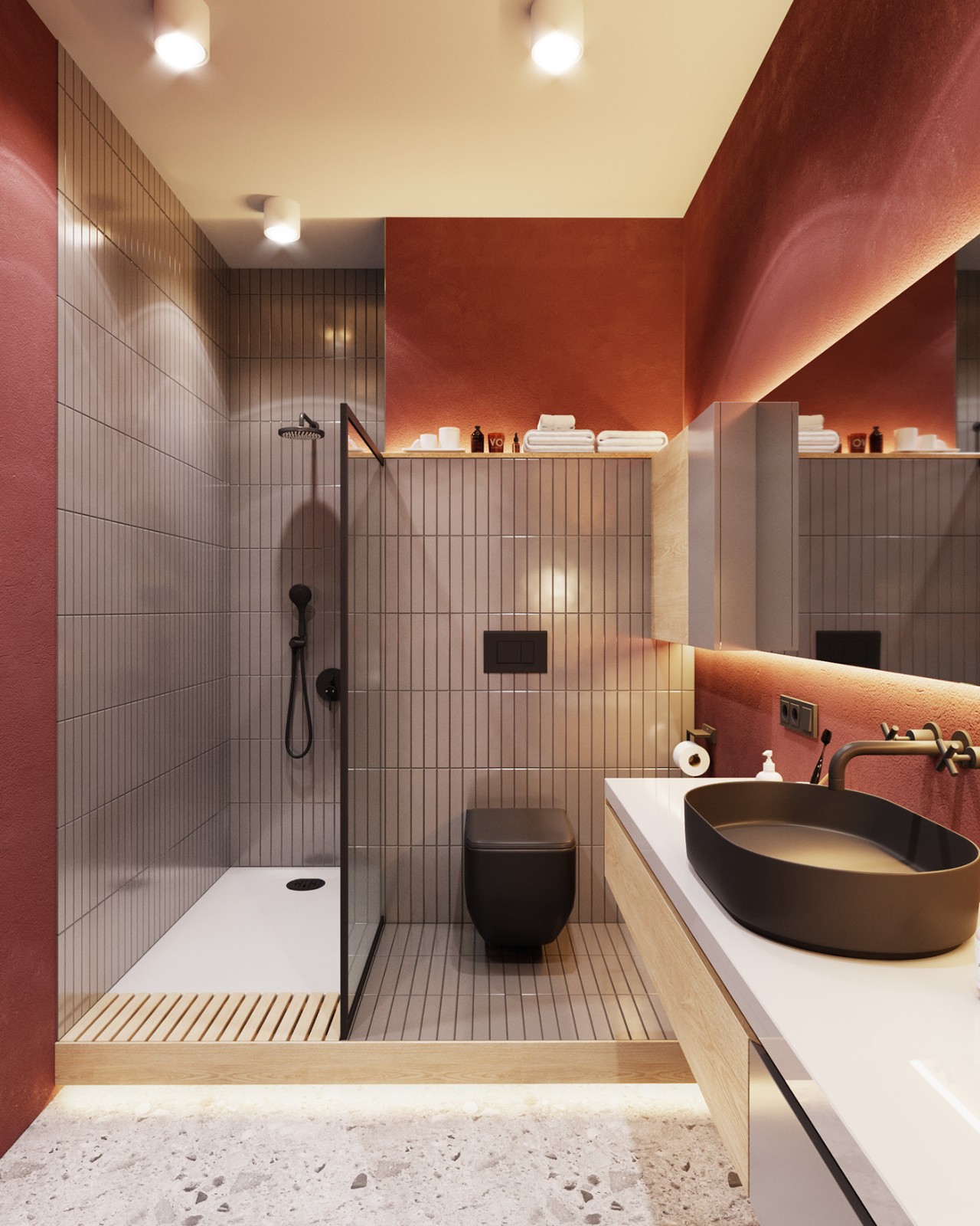 長條形的瓷磚和調(diào)色的防水涂料搭配出更明艷的效果