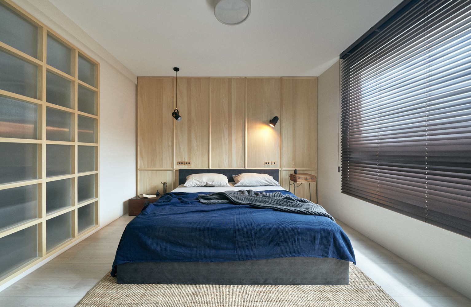 木板作為床頭背景,頂部簡(jiǎn)約的設(shè)計(jì)