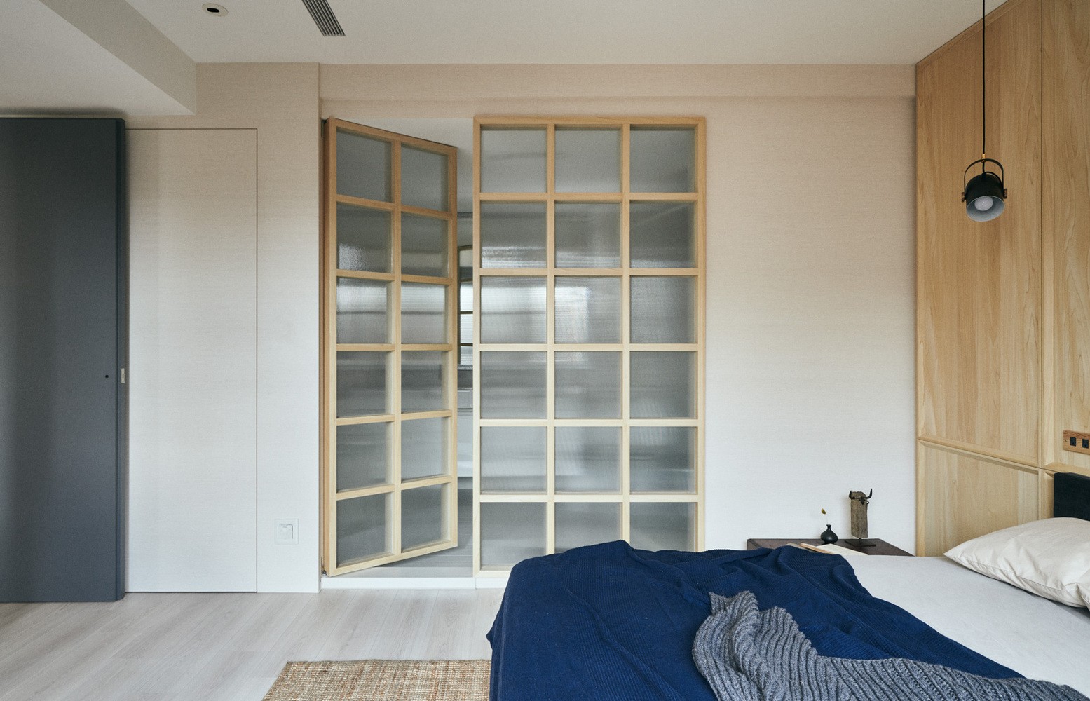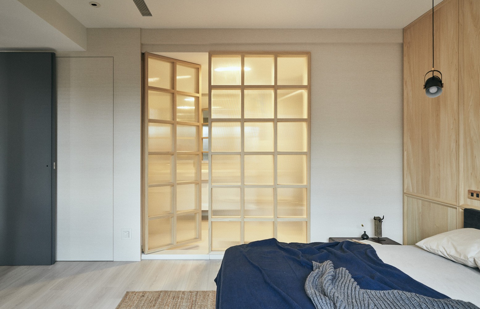 主臥衛(wèi)生間設(shè)計(jì)在臥室內(nèi),格子的門設(shè)計(jì)透光更墻