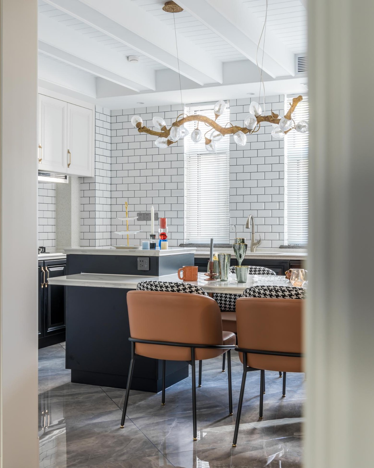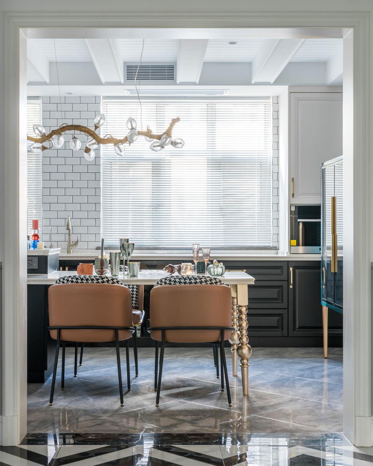 餐桌與島臺的功能合并, 勾勒出環(huán)形動線, 使廚房使用更加流暢便捷。