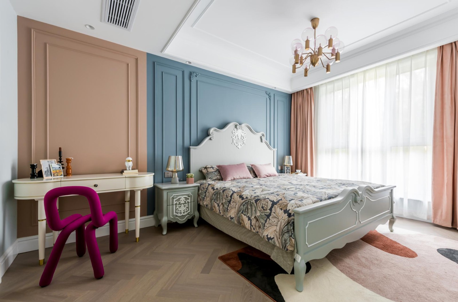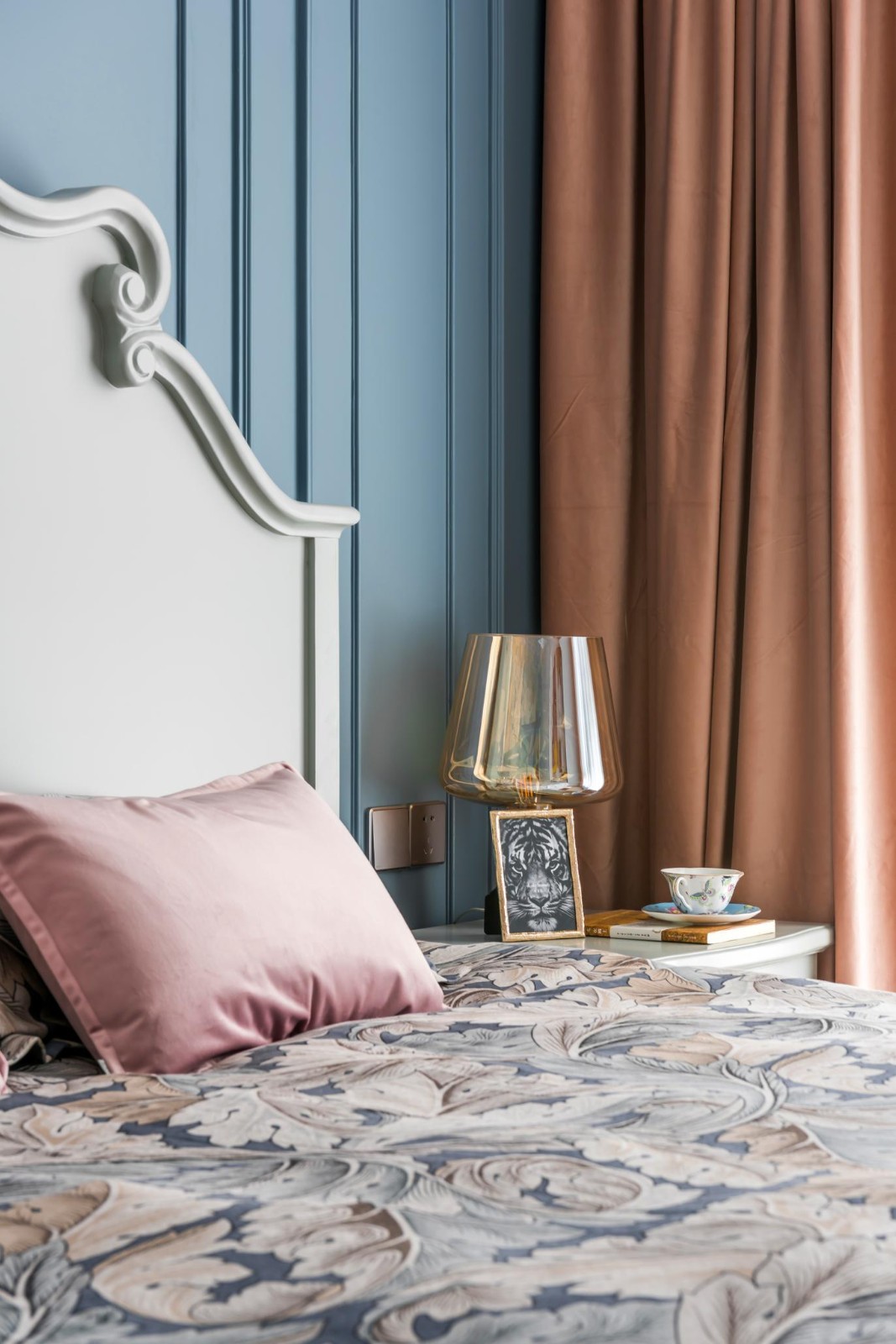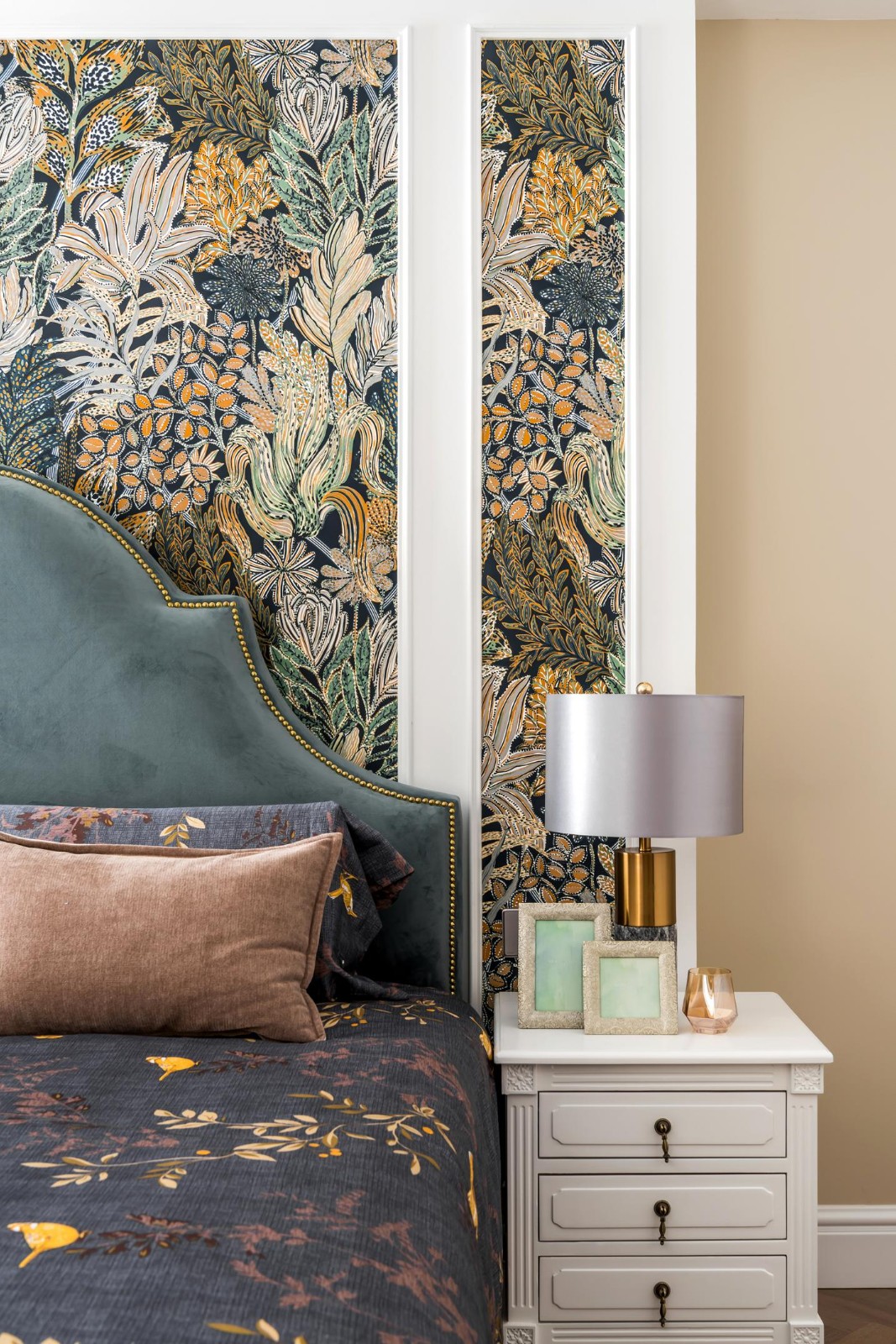 主臥的背景墻紙靈感來源于森林, 郁郁蔥蔥的植物花卉圖案生機(jī)勃勃, 意在為空間營造出一份自然和諧的氛圍。