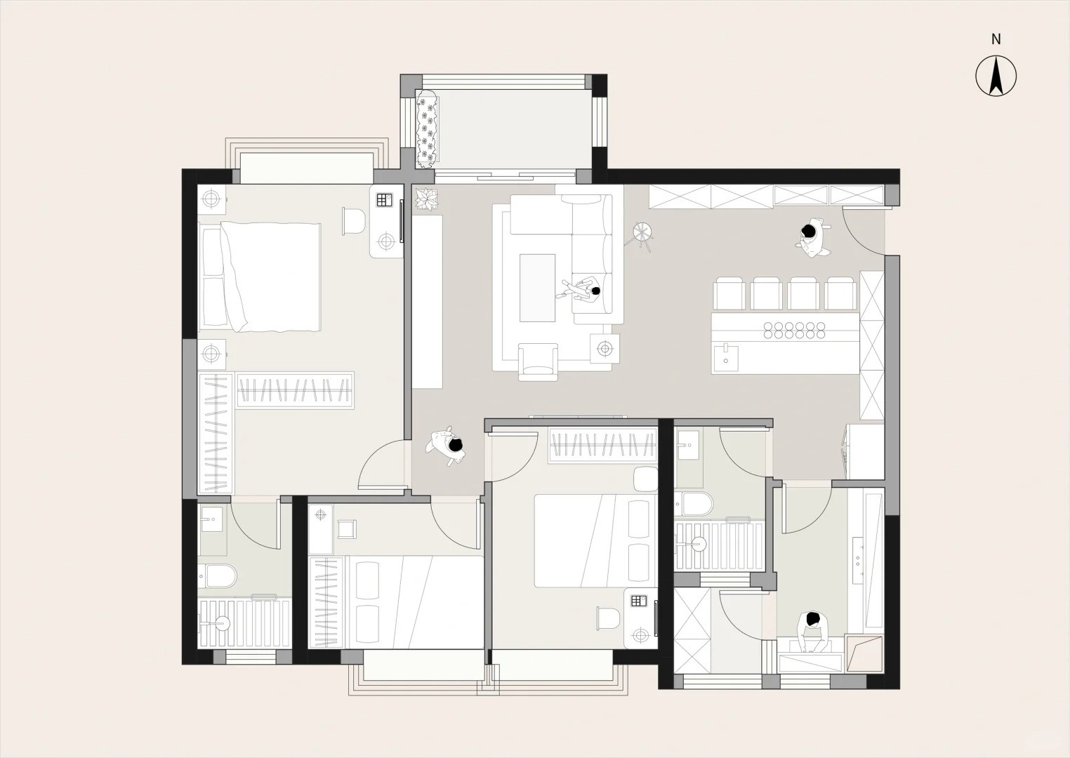 這套設計通過簡潔的線條和純白的基調,結合溫潤的木質材料和綠植的點綴。營造出一個舒適、溫馨、充滿藝術氣息的生活空間。每一個細節(jié)都經(jīng)過精心設計,既滿足了實用功能,又體現(xiàn)了主人的品味與追求。