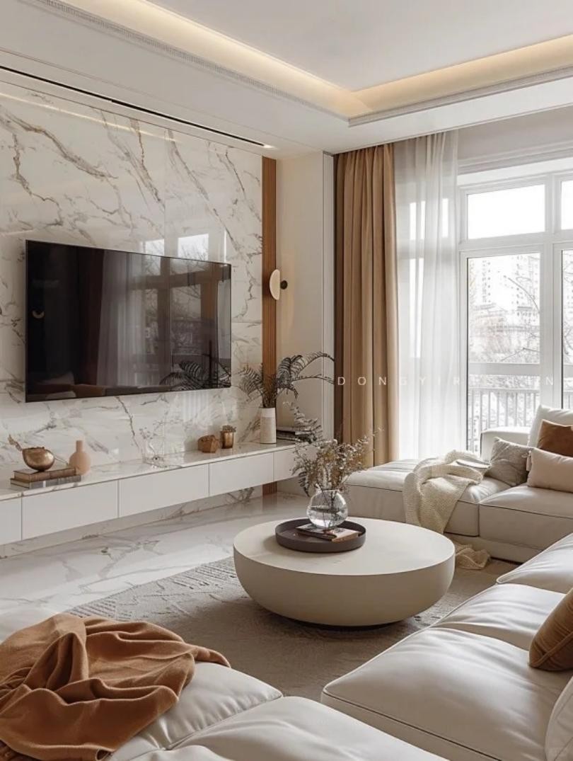 客廳整體采用白色基調,利用微妙的光影效果拉升藝術高度。大型落地窗和拱門設計相結合,增加了空間的通透感和藝術氛圍