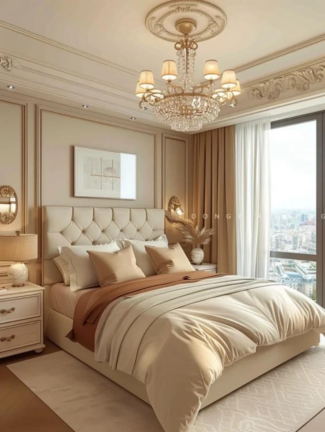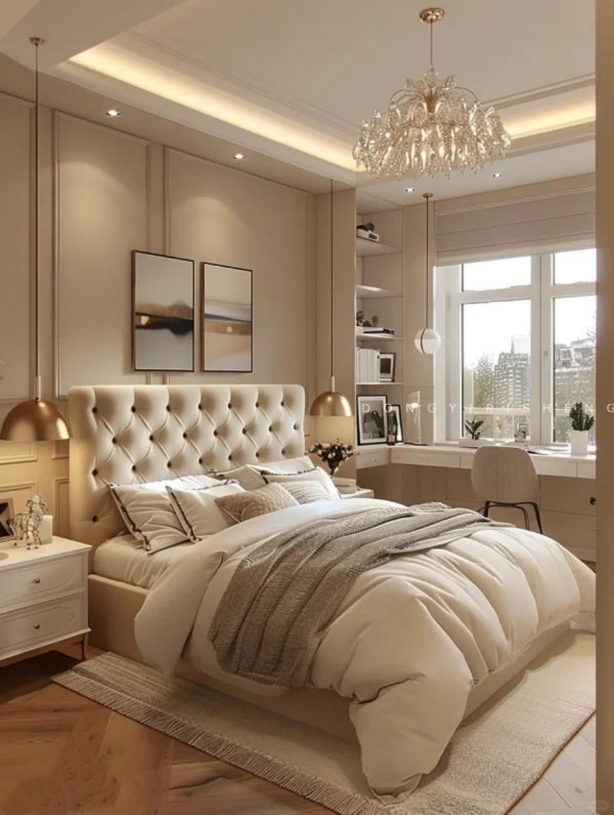 主臥房融入了法國風格,整體色調柔和,以白色和米色為主,營造出溫馨治愈的氛圍。墻面上簡單的法式線條裝飾,配合優(yōu)雅的吊燈,展現(xiàn)出法式的浪漫與精致。床品選用柔軟舒適的面料,配以溫暖的色調,使人感到放松與安逸。