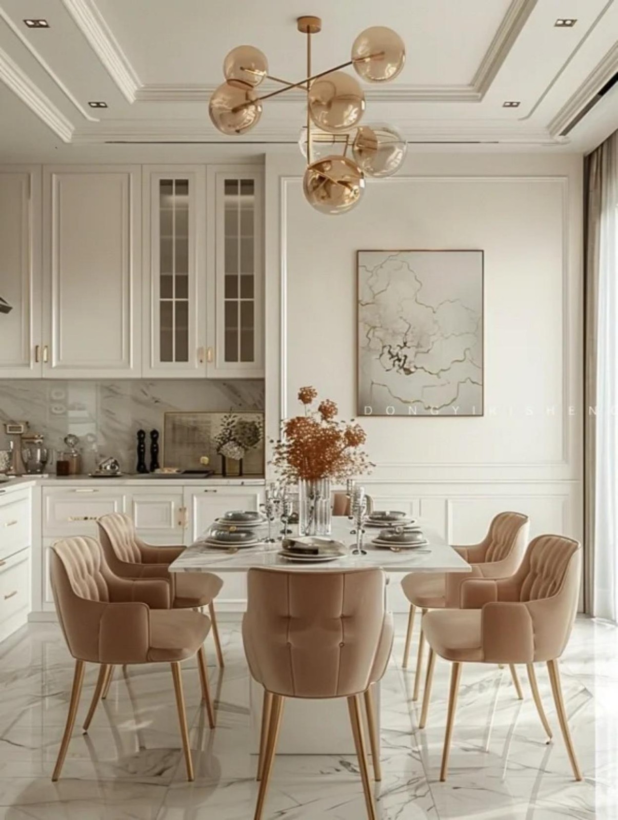 餐桌椅采用溫潤的木質材料,配合柔和的燈光,營造出溫馨的用餐氛圍。餐桌上擺放著一整套奶油色系的餐具,與整體風格相呼應,顯得格外養(yǎng)眼