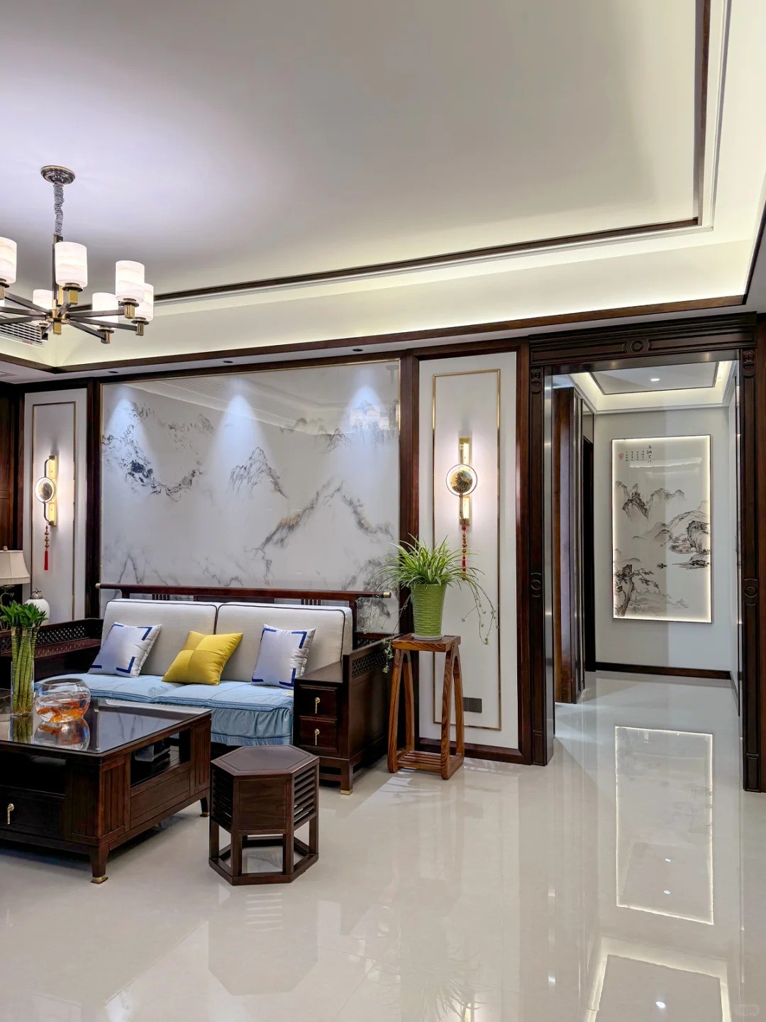 新中式風(fēng)格古香古色,綠植的擺放又增添一絲禪意