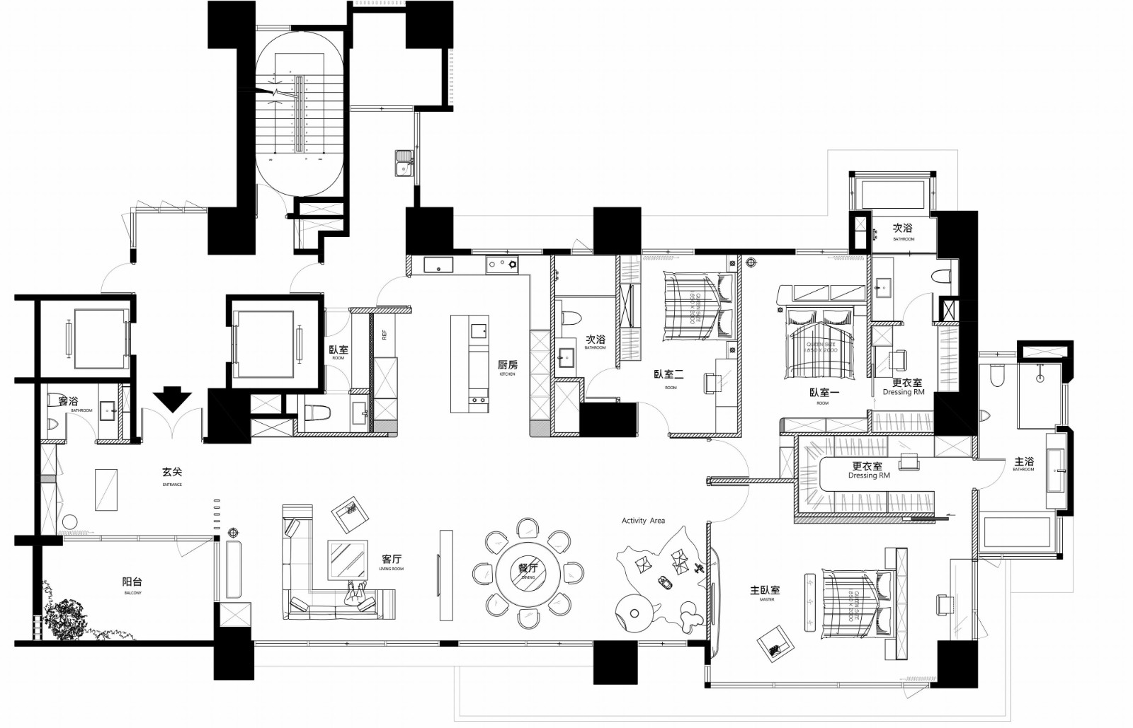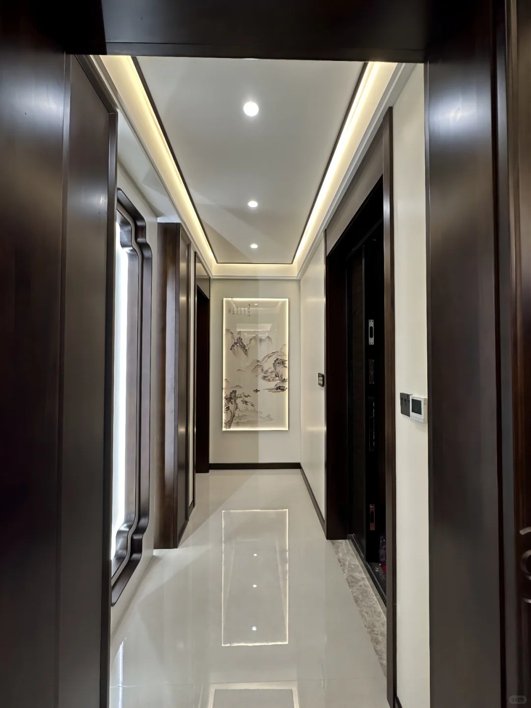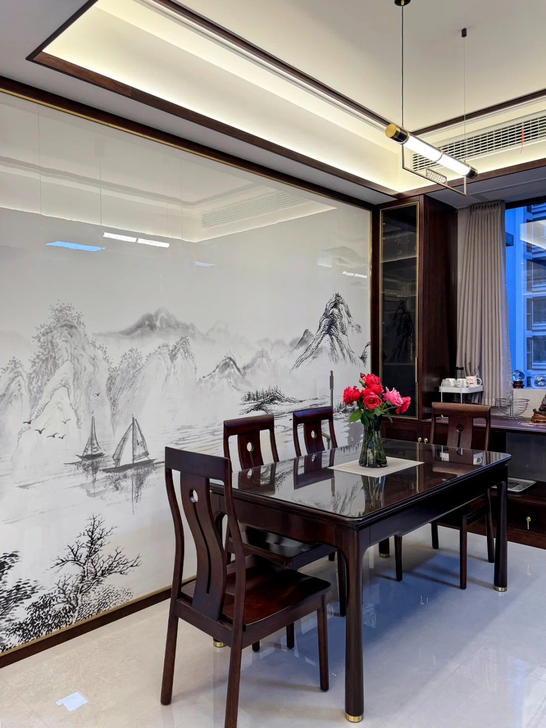 灰白色與黑檀色作為主色調(diào),石紋巖板背景搭配黑檀色的家具與定制柜。搭配出有別于傳統(tǒng)新中式的高雅感,配上少量裝飾面點(diǎn)綴出深遠(yuǎn)如詩(shī)般意境