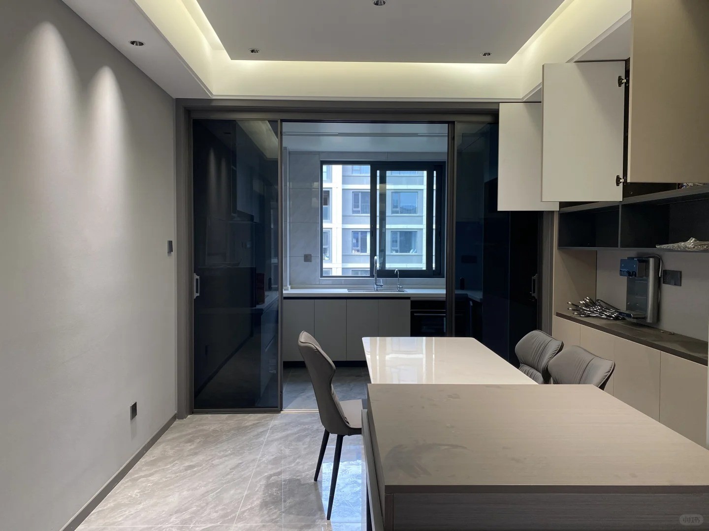 島臺(tái)上下都做了隱形的柜體收納,既保顏值又保收納。頂面的體塊切割中,嵌入不銹鋼吊頂打破平頂?shù)某翋灒照{(diào)出風(fēng)口、塊面之間的留縫,都呈現(xiàn)出恰到好處的完美。