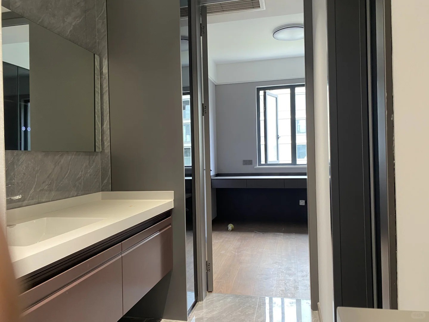 盥洗臺(tái)另一側(cè),則見(jiàn)縫插針,加入了隱形的兩門柜。全屋分布的收納系統(tǒng),無(wú)時(shí)不刻地著眼未來(lái),以維持現(xiàn)代極簡(jiǎn)的狀態(tài)。