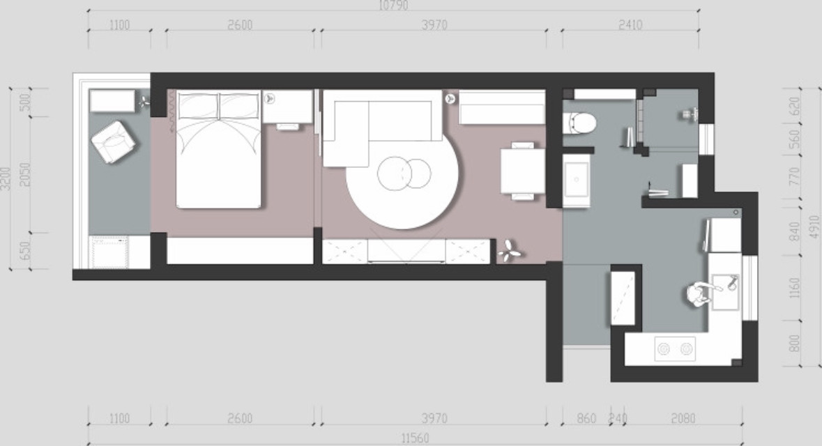 其實(shí)原戶型中,現(xiàn)在的餐廳客廳和臥室式融為一體的,并沒(méi)有明確區(qū)分各區(qū)域,現(xiàn)在的餐廳是在客廳的角落靠墻處安放了一個(gè)餐桌,從而表示為餐廳區(qū)域,客餐廳不必明顯做各類分割,對(duì)于小戶型來(lái)說(shuō),空間共享是個(gè)比較好的思路,無(wú)論客廳或者餐廳都會(huì)感覺(jué)不是那么狹小急促。